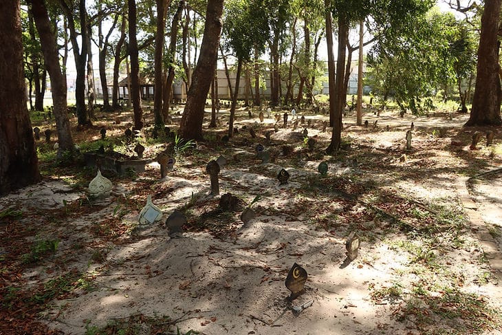 เราจะพบว่าหลุมสุสานของชาวมุสลิมโดยทั่วไปจะมีลักษณะเป็นสี่เหลียมผืนผ้าด้านกว้างทั้งสองด้านมักจะมีเครื่องหมายปักไว้โดยปักในตำแหน่งศีรษะและปลายเท้าของผู้ล่วงลับ วัสดุที่นำมาใช้มีทั้ง ก้อนหิน ไม้ หรืออาจจะทำจากปูนซีเมน นอกจากวัสดุที่แตกต่างกันภาษาที่ใช้เรียกเครื่องหมายบนหลุมสานก็มีความน่าสนใจเป็นอย่างมาก เพราะมีคำที่มีรากมาจากภาษามลายูปตานี มลายูเคดะห์ และในภาษาไทยถิ่นใต้ผสมกัน จึงทำให้เกิดเป็นคำเรียกของคนในพื้นที่เอง