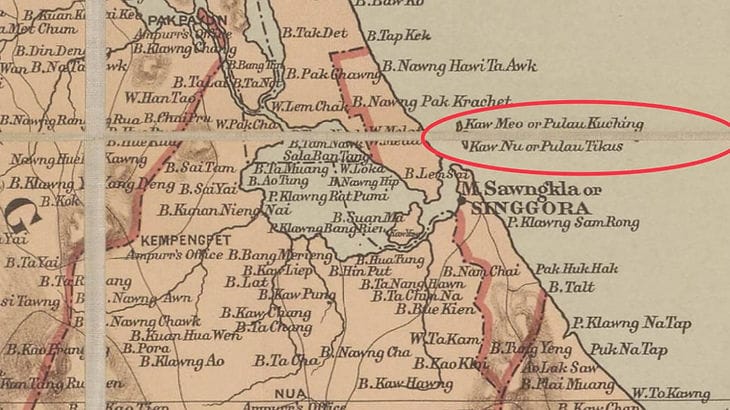 ในแผนที่คาบสมุทรมลายูตีพิมพ์ปีพ.ศ.๒๔๕๔ แผนที่ฉบับนี้เขียนชื่อเกาะทั้งสองทั้งภาษาไทยด้วยตัวอักษรภาษาอังกฤษ และภาษามลายูโดยเขียน ดังนี้ Kaw Meo or Pulau kuching เกาะแมว หรือ ปูเลา กูจิง ( Pulau แปลว่าเกาะ Kucing แปลว่า แมว ) และ Kaw Nu or Pulau Tikus เกาะหนูหรือ ปูเลา ตีกุส ( Pulau แปลว่าเกาะ Tikus แปลว่า หนู ) [๒]