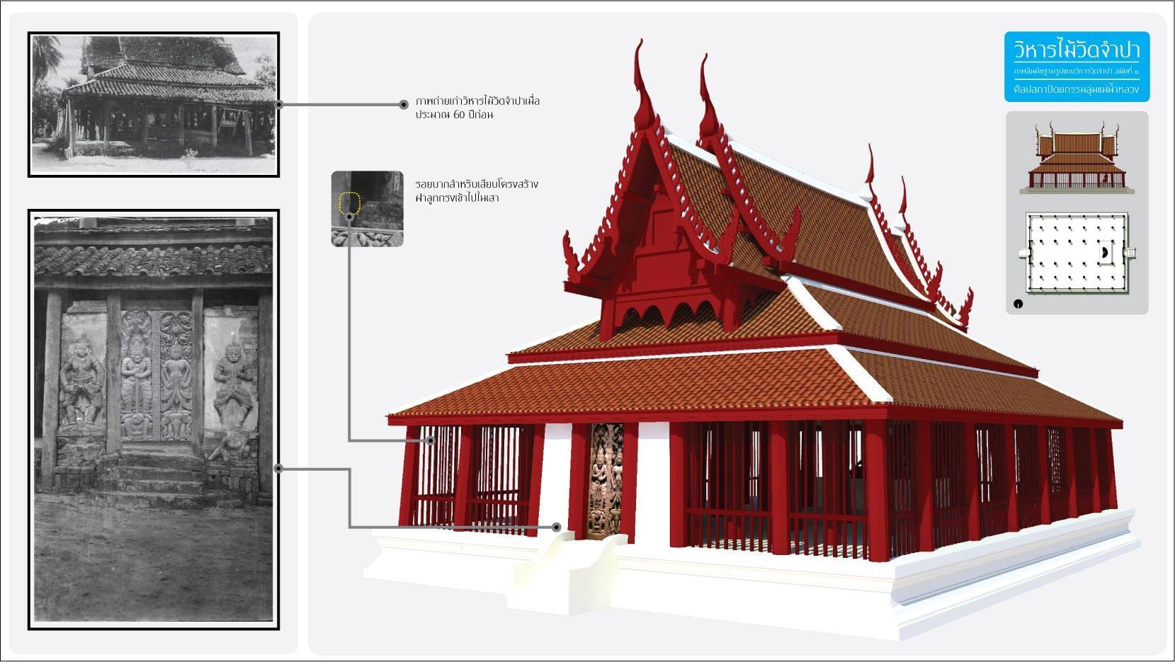 วิหารไม้สมัยอยุธยาตอนปลาย อันสง่างามด้วยรูปทรง โครงสร้าง การประดับตกแต่งส่วนหน้าบันด้วยกนกก้านขดอย่างมีชั้นเชิง วิหารหลังนี้ผ่านการเวลามานาน จากรุ่งเรืองสู่โรยรา และกลับฟื้นคืนความงดงามอีกครั้งในปัจจุบันนี้ ภาพของวิหารหลังนี้ทั้งเก่าและใหม่สามารถหาชมได้ทั่วไปในอินเตอร์เน็ตแล้ว คิดอย่างจึงจะละส่วนนั้นไว้ และจะขอนำเสนอประเด็นเกี่ยวกับลักษณะดั้งเดิม ย้อนกลับไปยุคแรกสุดของวิหารนี้ในสมัยอยุธยากันครับ