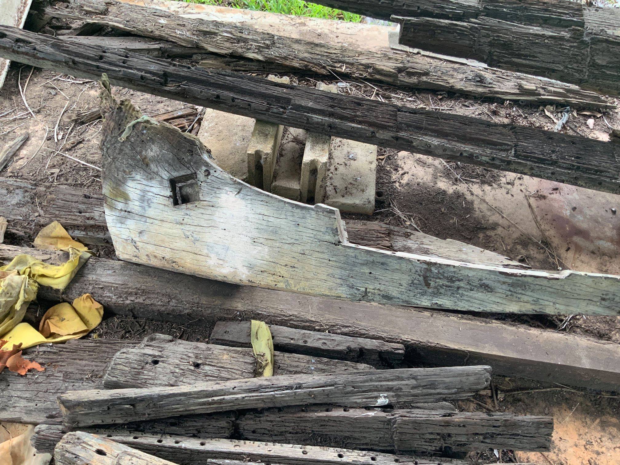 ที่ตำบลทุ่งมีซากเรืออยู่ลำหนึ่ง #พบจากการขุดลอกสระน้ำเมื่อปี 2545 และเคยเป็นข่าวใหญ่พักหนึ่ง แต่ยังไม่มีใครในทีมสำรวจวันนี้เคยมาดูของจริงมาก่อน ผมเองก็ไม่ค่อยแน่ใจพิกัดว่ามันอยู่ตรงไหนแน่ ๆ ได้อาศัยวิทยานิพนธ์ของคุณเพลงเมธา ขาวหนูนา (1) ซึ่งระบุพิกัดทางภูมิศาสตร์เอาไว้เป็นเครื่องนำทาง ตำแหน่งที่พบเรืออยู่ลึกเข้ามาในสวนปาล์ม สระน้ำที่เจอเรือนั้นยังอยู่ ตัวเรือได้รับความเสียหายจากแรงกระแทกของแบ๊คโฮ ชิ้นส่วนหลุดออกจากกัน เจ้าของพื้นที่ได้กู้ซากเรือขึ้นมาไว้ข้าง ๆ สระน้ำ