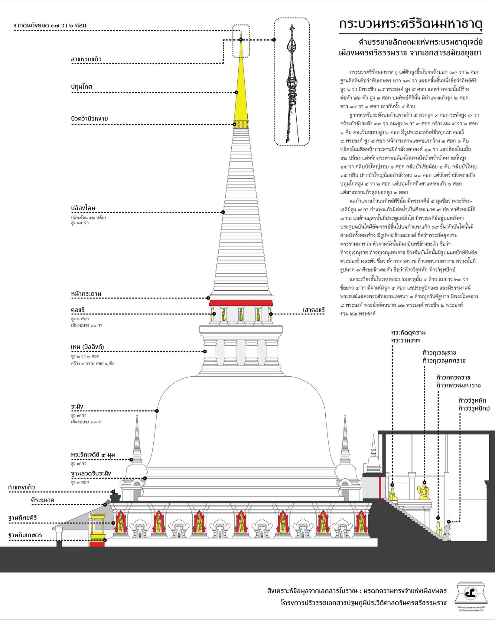 แบบพระบรมธาตุเขียนขึ้นใหม่โดยใช้ภาพประกอบจากบทความ มรดกพุทธศิลปสถาปัตยกรรม วัดพระบรมธาตุนครศรีธรรมราช อ.ดร.เกรียงไกร เกิดศิริ อิสรชัย บูรณะอรรจน์ และดร.นันทวรรณ ม่วงใหญ่ (โปรดดู : http://www.tci-thaijo.org/…/NAJUA-Arch/article/view/44340)