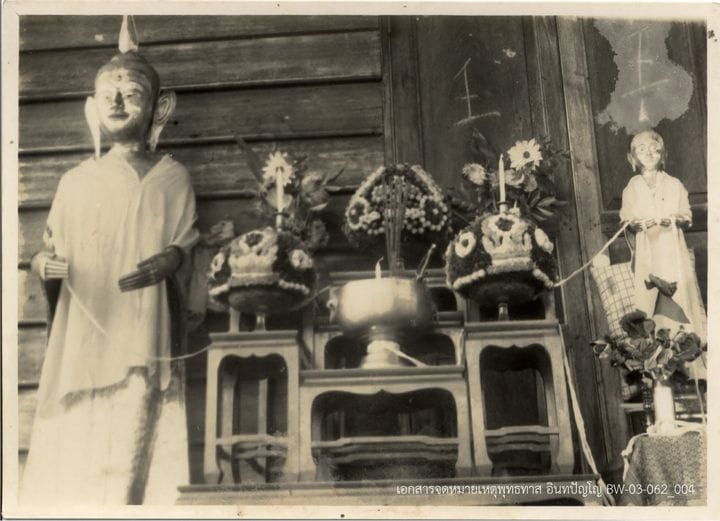 ไม่ทราบปี และวาระที่ถ่าย อาจจะเป็นภาพในวาระที่อาจารย์พุทธทาสรับตำแหน่งเจ้าอาวาสเมื่อพุทธศักราช ๒๔๘๒พระลากองค์นี้โกลนเป็นไม้ ผู้ที่ได้เคยตรวจดูใกล้ชิดสันนิษฐานว่าเป็นไม้ขนุนทอง เนื่องจากเนื้อไม้ค่อนข้างเหลือง และน้ำหนักเบา ไม้ขนุนทองเป็นไม้ที่นิยมใช้ทำพระลากทั่วไปในเขตนครศรีธรรมราชด้วย องค์พระบุด้วยแผ่นเงิน หัวนมพระพุทธรูปเป็นทอง พระรัศมีของพระพุทธรูปเป็นไม้บุทอง มีอุณาโลมทองประดับพลอยที่พระนลาฎ มีพุ่มข้าวบิณฑ์ทองประดับพลอยที่ประคดเอว