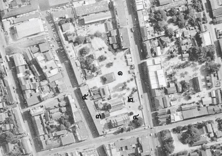 ภาพถ่ายทางอากาศของวัดวังตะวันตกในปี ๒๕๑๗ (โครงการ น.ส.3 (2515 – 2522) กรมแผนที่ทหาร)