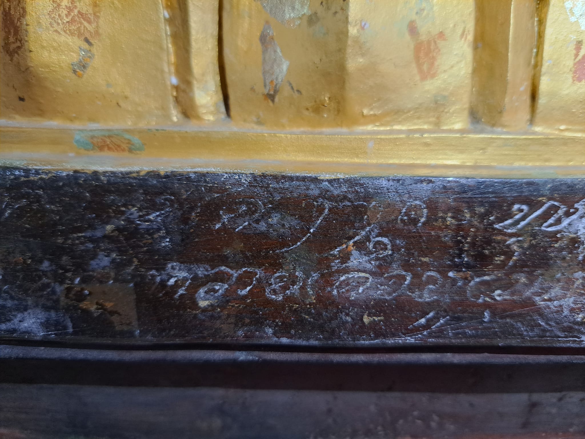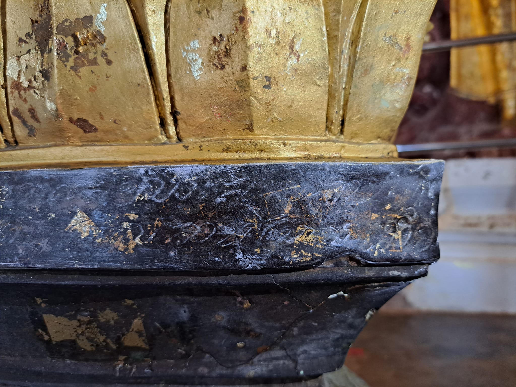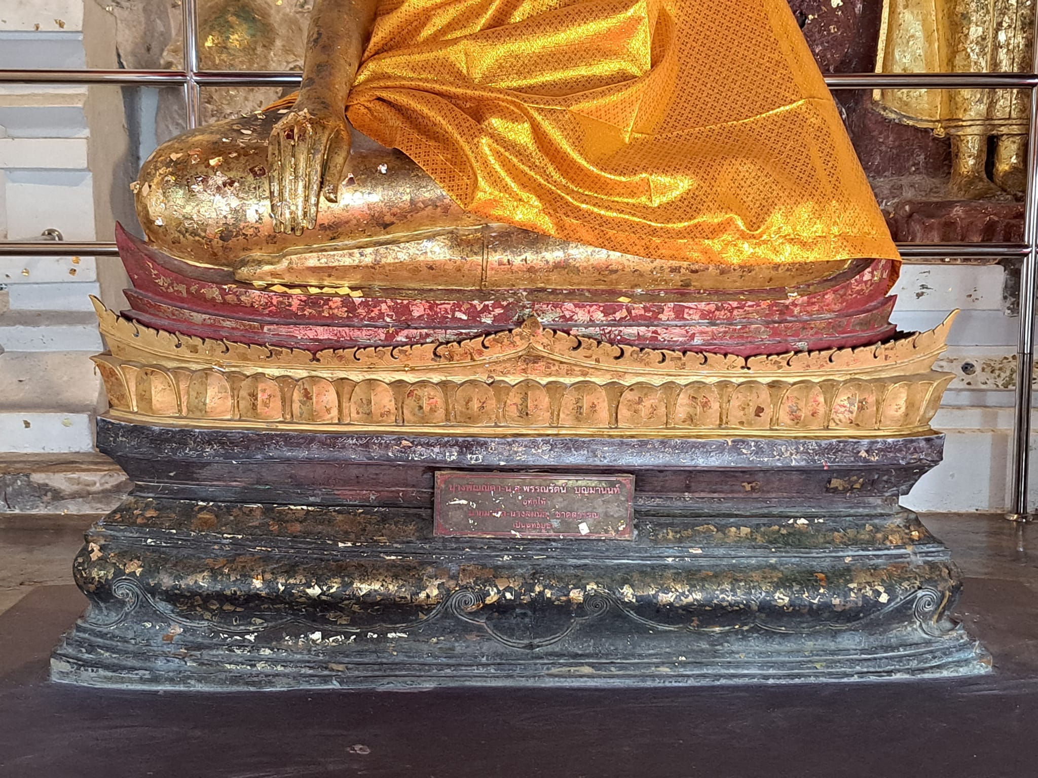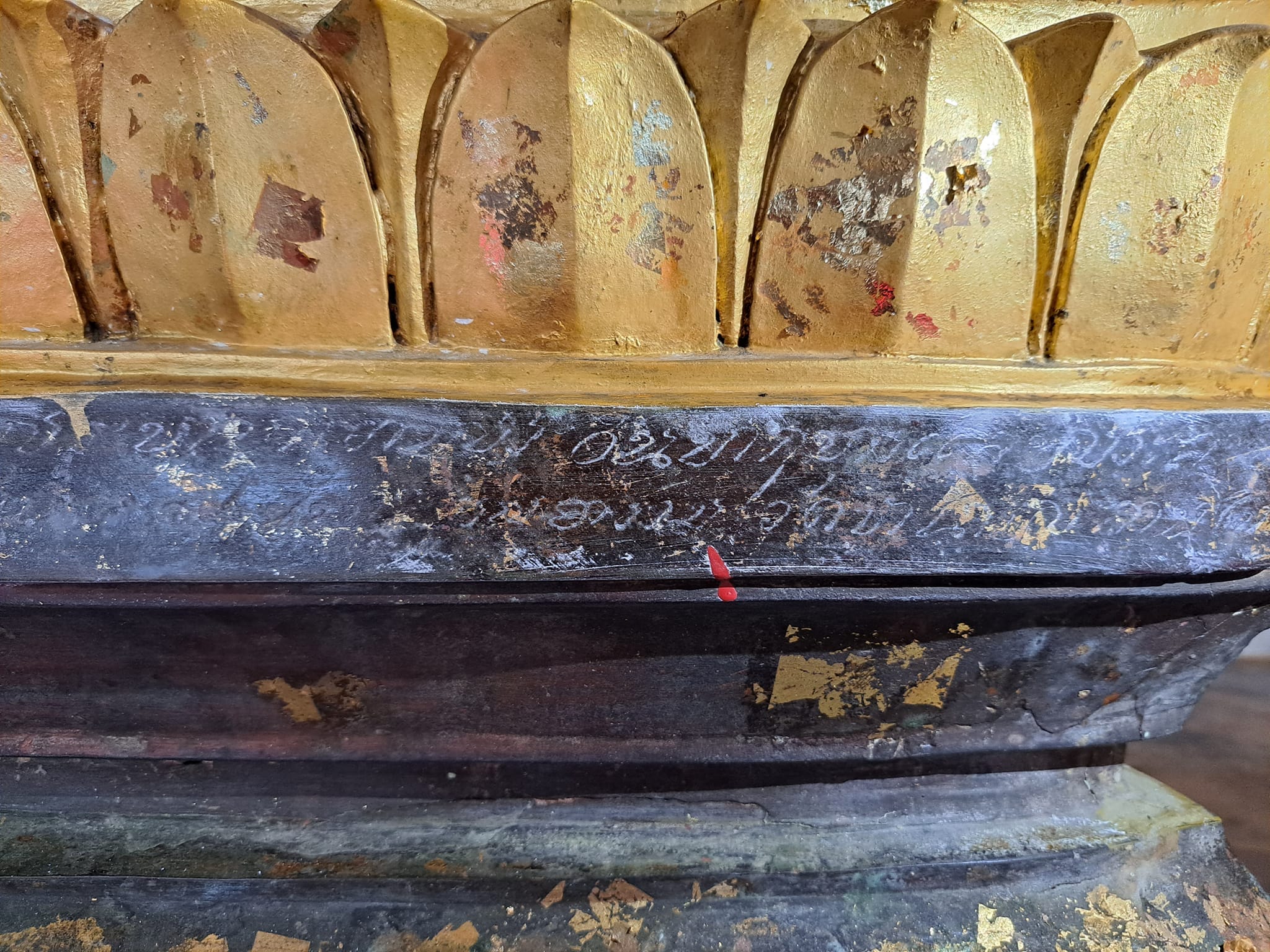 – ร้ามแลออกพระสุวัณโกษา แลสำบรุษทั้งหลายไดอนุโมทนาปรดิศถา ณ พระพุทธรูปนีเปนขี้ผึ้ง ๔๔ ชัง เปนทอง ๔๕๐ ชัง ในอาทเป็นขี้ผึ้ง ๑๘ ชัง เปนทอง ๑๙๐ ชัง บริบูรณ อารามวัดหนาพลานใหญ่ เมื่อแตงแล้วบริบูรณวันพฤหัศบดี เดือนยี่ ขึ้น ๕ ค่ำ ชวดจัตวาตรีศก –