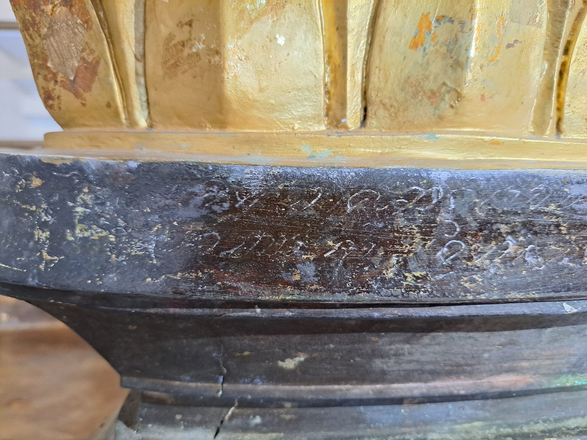จารึกที่ฐานว่า – วรสุพมัศดุ มังคลาดิเรก พุทธศักราชได ๒๒๑๔ พระพรรณสา จุลศกได ๑๐๓๓ ปีกุญ ตรีนิศก เดือนสิบ ขึ้นสิบค่ำ วันพระหัสบดี พระบาทเจาพระอินทกุมารแลพระสงฆเจาทังอา –