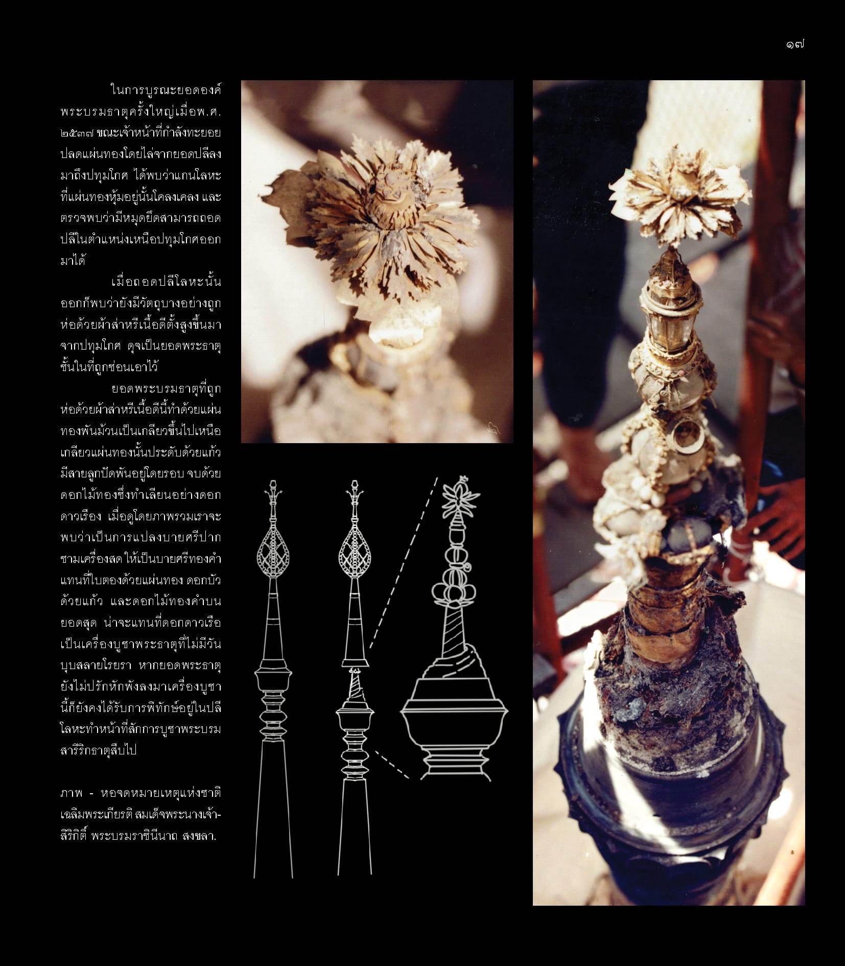 เอลเมนต์ของปทุมโกศที่ปรากฏอยู่เหนือลูกแก้วคั่นปลีนั้นจึงไม่ได้ถูกแทรกเข้ามาเป็นดีเทลโดด ๆ #แต่ทำหน้าที่พานของบายศรีปากชามทองคำ ต่างเครื่องบูชาพระธาตุที่ไม่มีวันบุบสลายโรยรา หากยอดพระธาตุยังไม่ปรักหักพังลงมาเครื่องบูชานี้ก็ยังคงได้รับการพิทักษ์อยู่ในปลีโลหะสืบไป