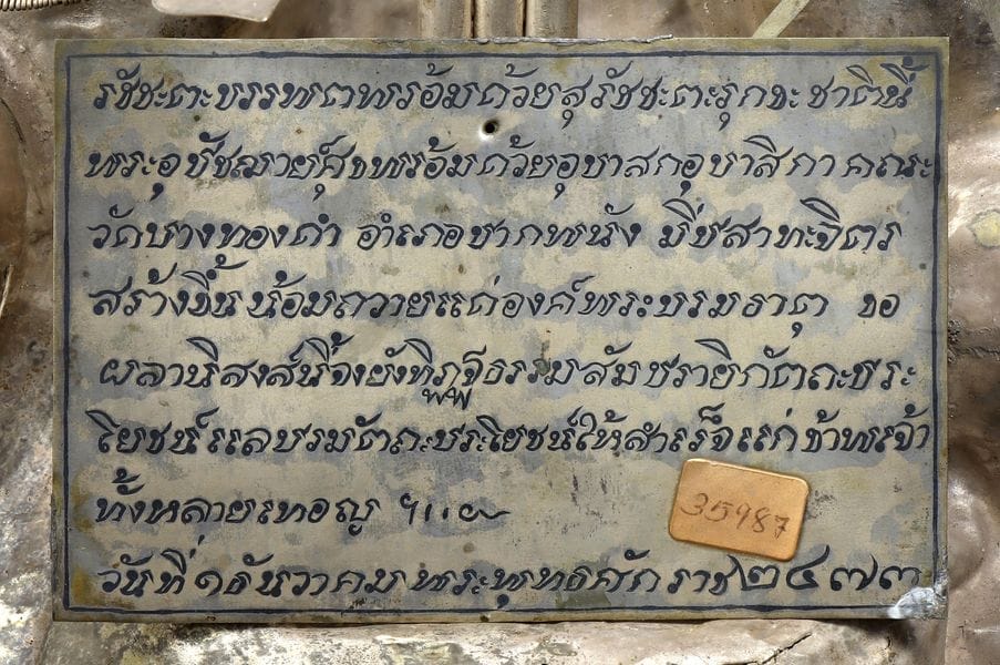 รัชชะตะบรรพต พร้อมด้วยสุรัชชะตะรุกขะชาตินี้ พระอุปัชฌาย์ศุขพร้อมด้วยอุบาสกอุบาสิกา คณะวัดบางทองคำ อำเภอปากพนัง มีปสาทะจิตร สร้างขึ้นน้อมถวายแด่องค์พระบรมธาตุ ขอผลานิสงส์นี้จงยังทิฎฐธรรมสัมปรายิกัตถะประโยชน์ แลปรมัตถะประโยชน์ให้สำเร็จแก่ข้าพเจ้าทั้งหลายเทอญ ๚ะ๛