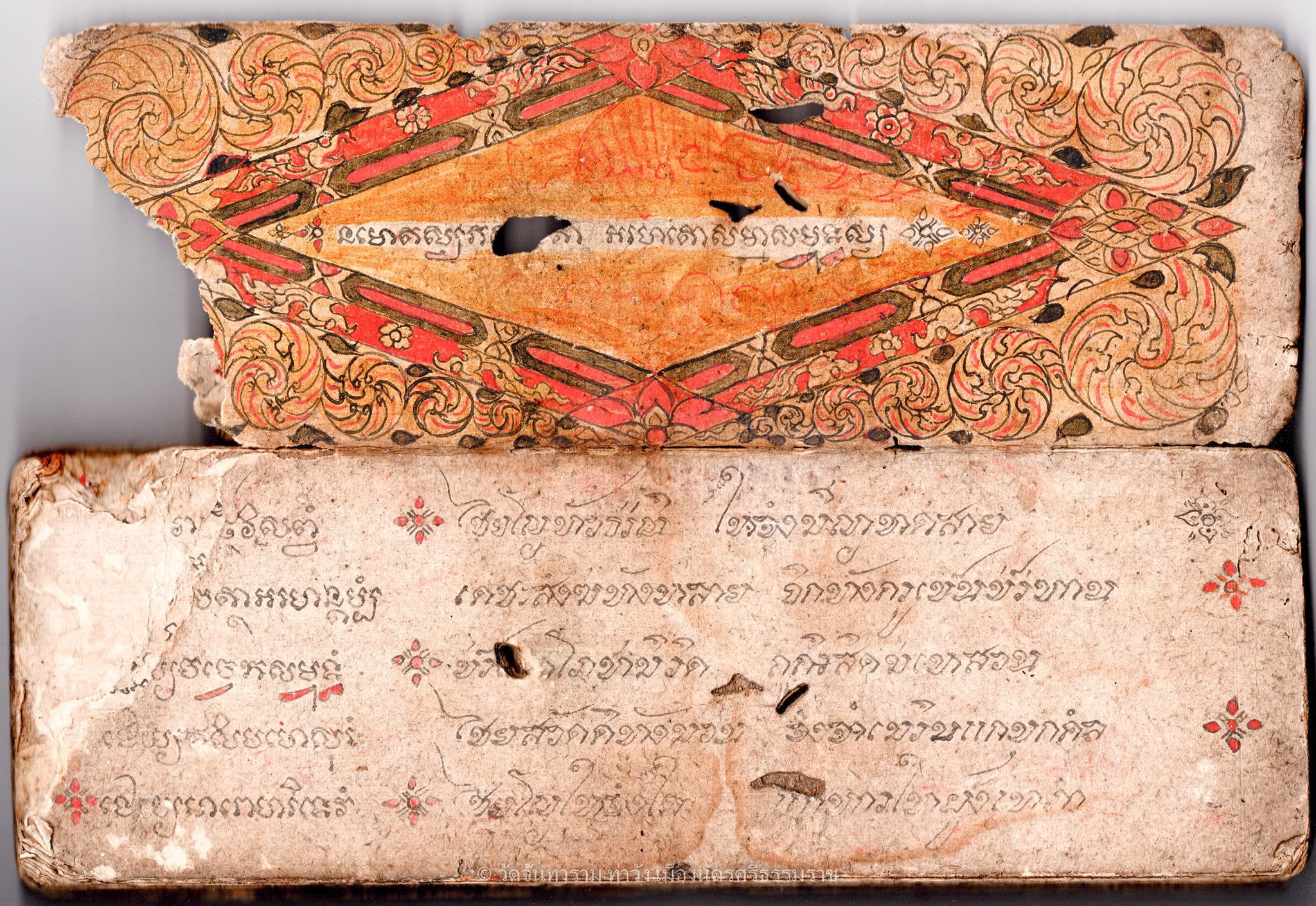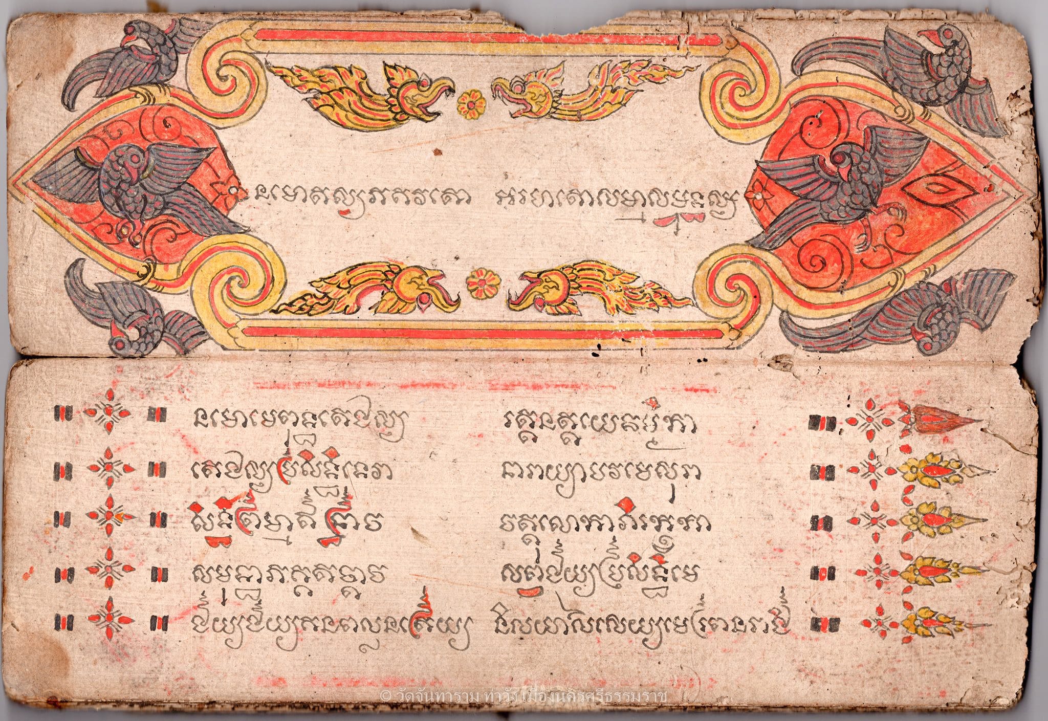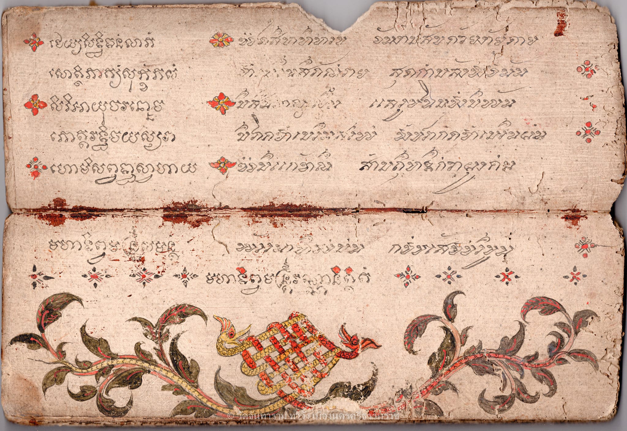 มีข้อความท้ายบุดระบุว่า “เขียนจํบณ่วันสุก เดือน ๑๑ แรม ๘ คำปียขานฉสํกยูไนวัดสันต่ร่ดู สาศน้าพระสับภันญูเจาลวงไปยแล้วใด ๒๓๓๗ พระวัณสาแลยังอีก ๒๖๖๒ ภระวัณ่สาแล้ นิพฺพาณปจฺจโยโหติ อนาคเต – จบ พระทีพ่มนณีย สิยกาทองแก้ว ใดวสางใวไนยพระสาศณ้าแล้ ข้าพ่เจาฅ่อญาอุบัด เมืองนอกสรํพ่สัด ปัดจันท่เสม้า อนึ่งญาเกิดอ่สัรรเญอ่สันตา พรํมมาจ่โลกา เปนอาภัพ่บุกคํล อนึงญาใดเกีด ซืงรูบอัรพีกํล ไจยรายเจียร่จํล มิดฉาทีดถิ ฅ่อใหมียสวัดดี ฃ่อมิยปันญาเสมิอนพระม่โหสํด ฃ่อมีนำไจยอํดเสมีอนภระเตหมี ฃ่อมังฃ่มีเสมีอนเทาสียสํนไชย”