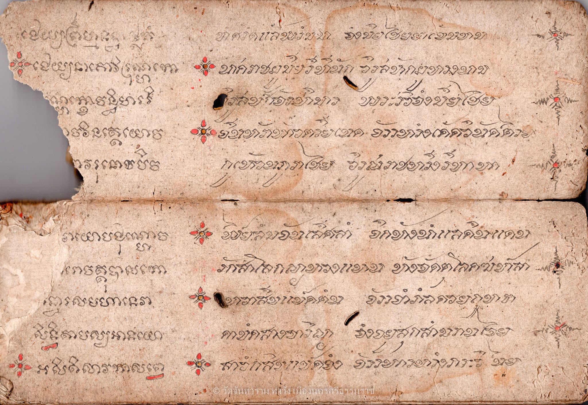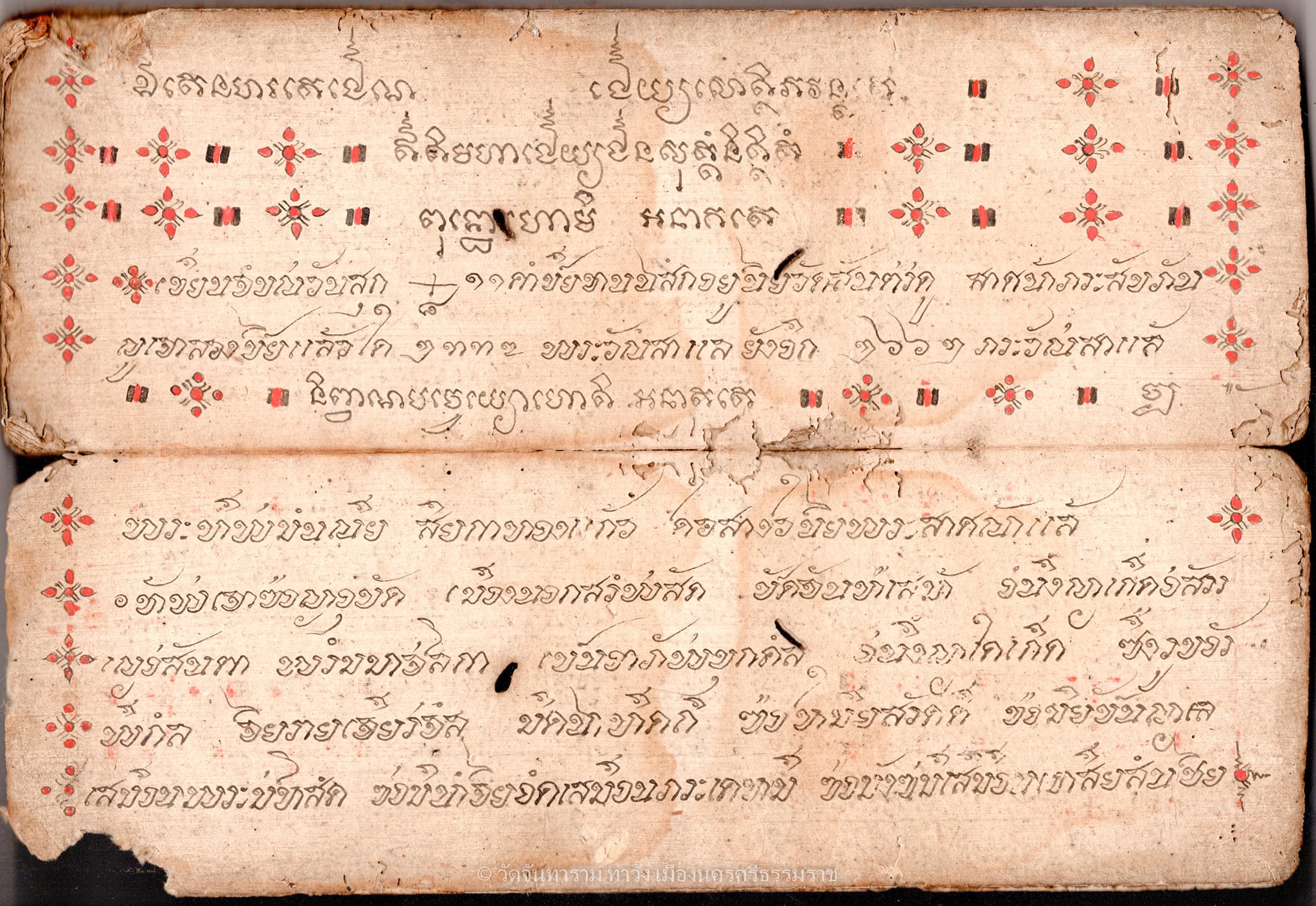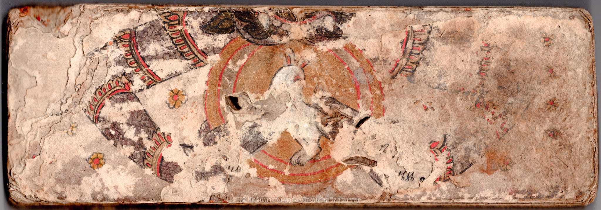 มีข้อความท้ายบุดระบุว่า “เขียนจํบณ่วันสุก เดือน ๑๑ แรม ๘ คำปียขานฉสํกยูไนวัดสันต่ร่ดู สาศน้าพระสับภันญูเจาลวงไปยแล้วใด ๒๓๓๗ พระวัณสาแลยังอีก ๒๖๖๒ ภระวัณ่สาแล้ นิพฺพาณปจฺจโยโหติ อนาคเต – จบ พระทีพ่มนณีย สิยกาทองแก้ว ใดวสางใวไนยพระสาศณ้าแล้ ข้าพ่เจาฅ่อญาอุบัด เมืองนอกสรํพ่สัด ปัดจันท่เสม้า อนึ่งญาเกิดอ่สัรรเญอ่สันตา พรํมมาจ่โลกา เปนอาภัพ่บุกคํล อนึงญาใดเกีด ซืงรูบอัรพีกํล ไจยรายเจียร่จํล มิดฉาทีดถิ ฅ่อใหมียสวัดดี ฃ่อมิยปันญาเสมิอนพระม่โหสํด ฃ่อมีนำไจยอํดเสมีอนภระเตหมี ฃ่อมังฃ่มีเสมีอนเทาสียสํนไชย”