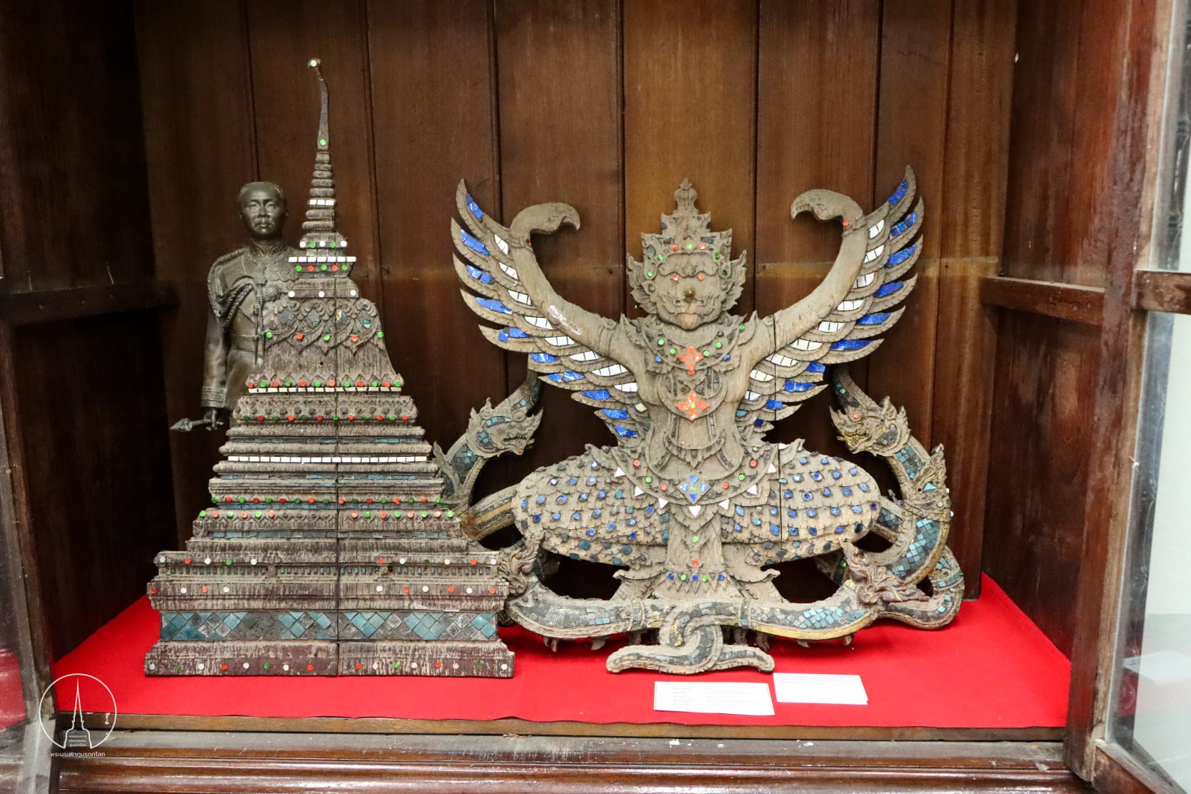 ชิ้นส่วนหน้าบันของประตูเหมรังษีดั้งเดิม เก็บรักษาอยู่ที่วิทยาลัยศิลปหัตถกรรม จังหวัดนครศรีธรรมราช ชิ้นส่วนครุฑ นาค และพระเจดีย์ไม้แกะสลักชุดนี้เดิมเป็นชิ้นส่วนประดับหน้าบันประตูเหมรังษี ประตูระเบียงคดเข้าสู่พระบรมธาตุ ซึ่งมีลักษณะเป็นครุฑ ขนาบด้วยนาค ที่เหนือสุดเป็นรูปพระเจดีย์ซึ่งน่าจะแทนองค์พระบรมธาตุเจดีย์ พระธรรมรัตโนภาส (ประดับ มาพูล) เจ้าอาวาสวัดพระมหาธาตุวรมหาวิหาร ได้มอบให้กับวิทยาลัยศิลปหัตถกรรม จังหวัดนครศรีธรรมราช เพื่อเก็บรักษาและเป็นตัวอย่างกรณีศึกษางานช่าง
