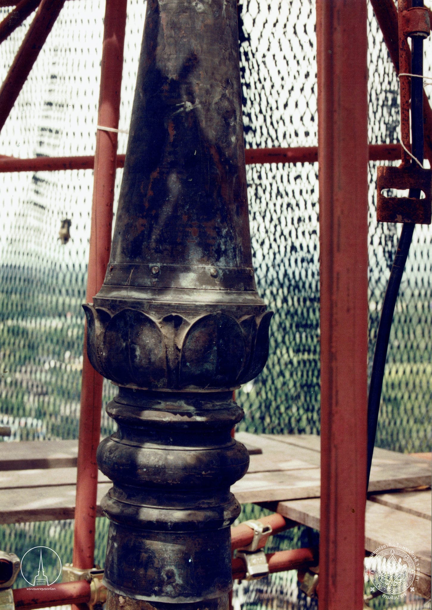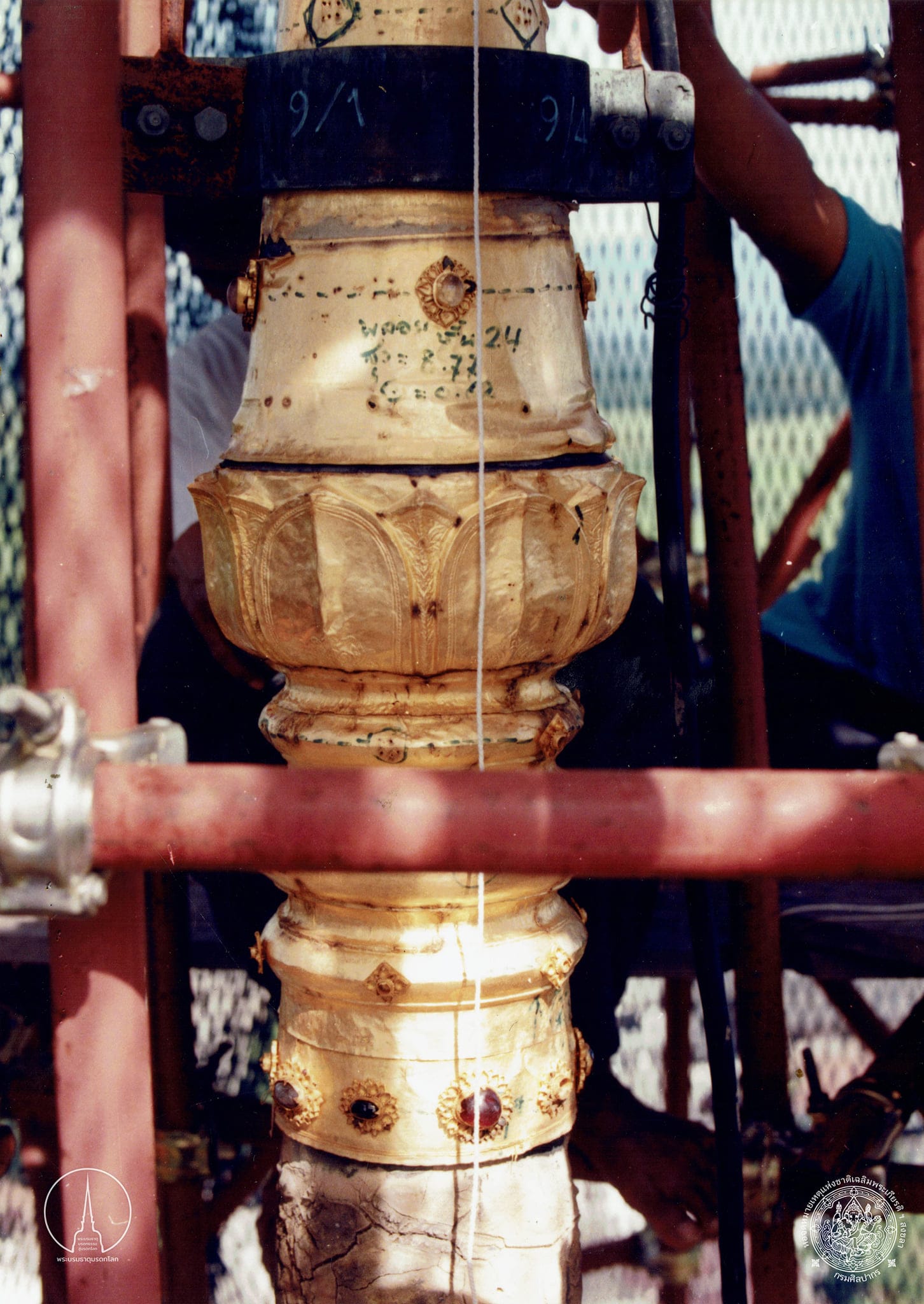 ในการบูรณะยอดพระบรมธาตุครั้งใหญ่เมื่อ ๒๕๓๗ ขณะเจ้าหน้าที่กำลังค่อย ๆ ทะยอยปลดแผ่นทองไล่จากยอดปลีลงมาถึงตำแหน่งปทุมโกศนี้ พบว่าแกนที่แผ่นทองหุ้มอยู่ซึ่งเป็นโลหะนั้นโคลง ๆ ตรวจพบว่ามีหมุดยึดสามารถถอดปลีในตำแหน่งเหนือปทุมโกศออกมาได้ เมื่อถอดปลีโลหะนั้นออก ก็พบว่ายังมีวัตถุบางอย่างถูกห่อด้วยผ้าส่าหรีเนื้อดีตั้งสูงขึ้นมาจากปทุมโกศ #ดุจเป็นยอดพระธาตุชั้นในที่ถูกซ่อนเอาไว้