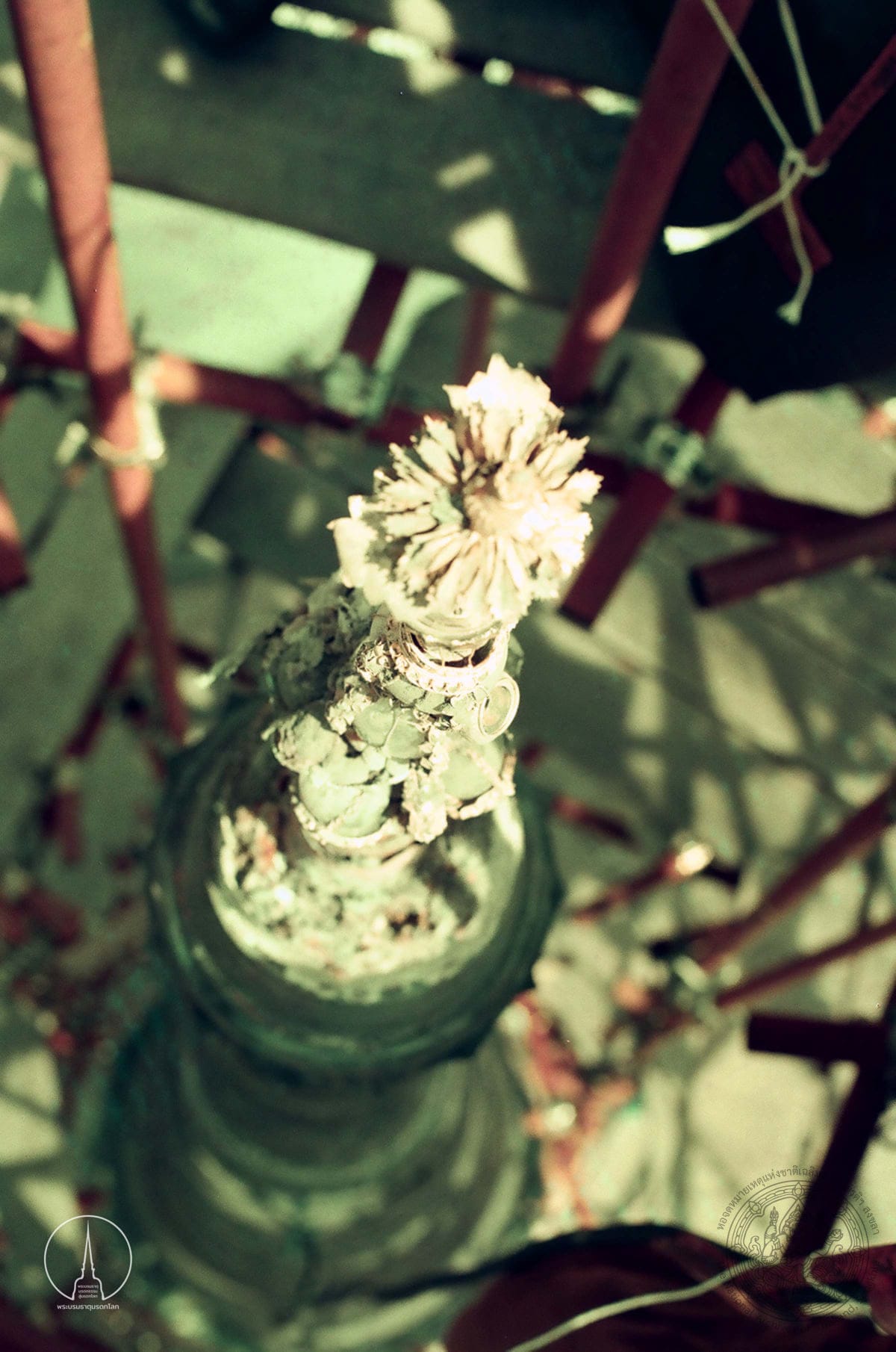 ยอดพระบรมธาตุที่ถูกห่อด้วยผ้าส่าหรีเนื้อดีนี้ พอคลี่ผ้าออกก็พบว่ายอดนั้นทำด้วยแผ่นทองพันม้วนเป็นเกลียวขึ้นไป เหนือเกลียวแผ่นทองนั้นประดับด้วยแก้ว มีสายลูกปัดพันอยู่โดยรอบ จบด้วยดอกไม้ทองซึ่งทำเลียนอย่างดอกดาวเรือง เมื่อดูโดยภาพรวมเราจึงเข้าใจได้ทันทีว่ายอดชั้นในนี้ เป็นการแปลงบายศรีปากชามเครื่องสด ให้เป็นบายศรีทองคำ แทนใบตองด้วยแผ่นทอง ดอกบัวด้วยแก้ว และดอกดาวเรืองด้วยทองคำอีกทีที่ยอดสุด