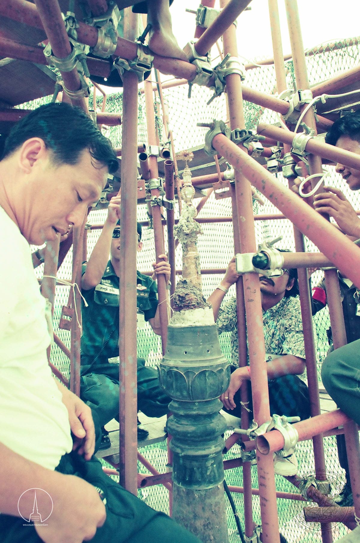 ในการบูรณะยอดพระบรมธาตุครั้งใหญ่เมื่อ ๒๕๓๗ ขณะเจ้าหน้าที่กำลังค่อย ๆ ทะยอยปลดแผ่นทองไล่จากยอดปลีลงมาถึงตำแหน่งปทุมโกศนี้ พบว่าแกนที่แผ่นทองหุ้มอยู่ซึ่งเป็นโลหะนั้นโคลง ๆ ตรวจพบว่ามีหมุดยึดสามารถถอดปลีในตำแหน่งเหนือปทุมโกศออกมาได้ เมื่อถอดปลีโลหะนั้นออก ก็พบว่ายังมีวัตถุบางอย่างถูกห่อด้วยผ้าส่าหรีเนื้อดีตั้งสูงขึ้นมาจากปทุมโกศ #ดุจเป็นยอดพระธาตุชั้นในที่ถูกซ่อนเอาไว้