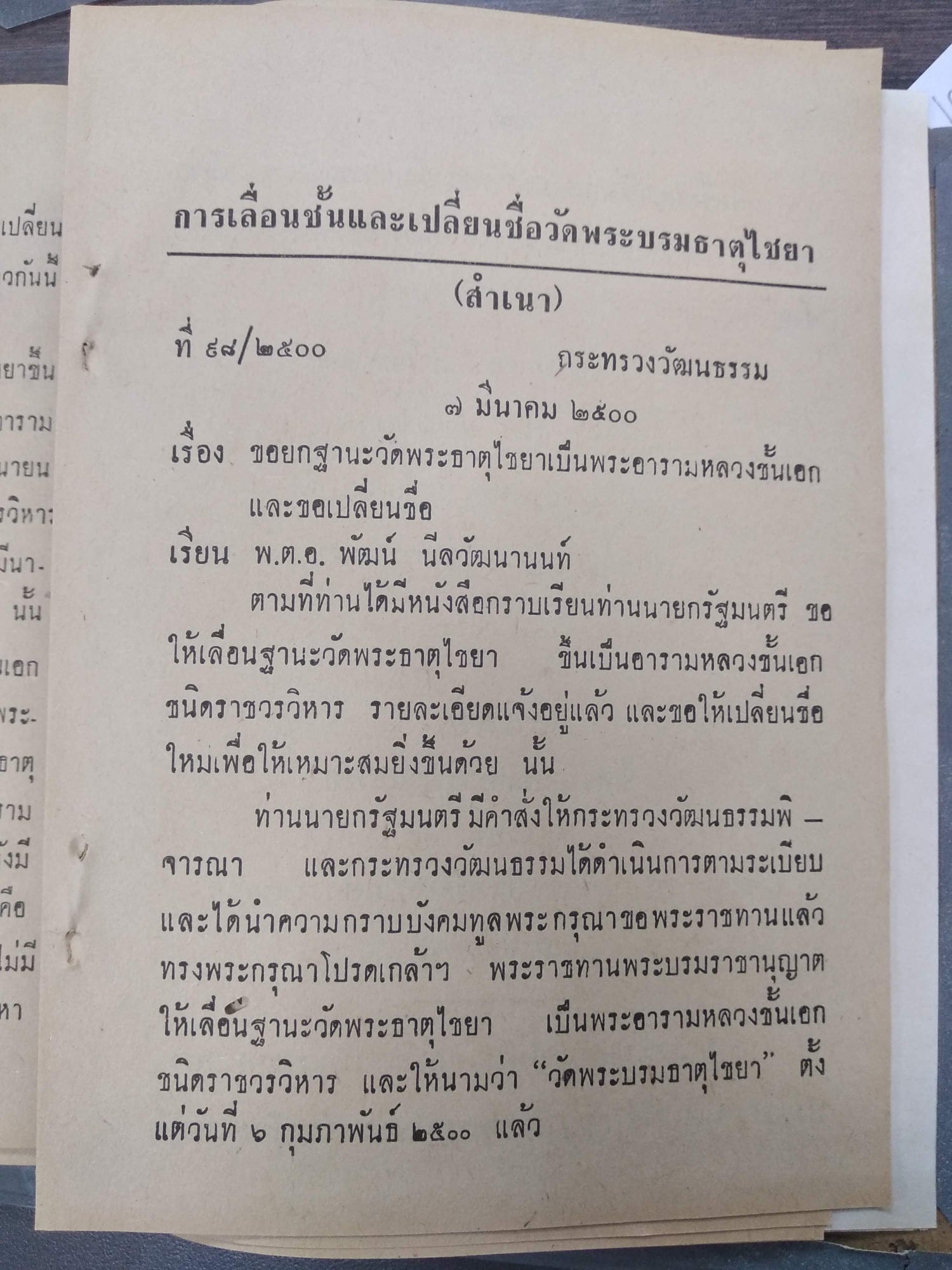 ครั้นต่อมา ได้รับหนังสือของเลขานุการรัฐมนตรีว่าการกระทรวงวัฒนธรรมที่ ๙๘/๒๕๐๐ ลงวันที่ ๗ มีนาคม ๒๕๐๐ แจ้งให้ทราบว่า “…#ทรงพระกรุณาโปรดพระราชทานพระบรมราชานุญาตให้เลื่อนฐานะวัดพระธาตุไชยาเป็นพระอารามหลวงชั้นเอก ชนิดราชวรวิหาร และให้มีนามว่า “วัดพระบรมธาตุไชยา” ตั้งแต่วันที่ ๖ กุมภาพันธ์ ๒๕๐๐ แล้ว…”