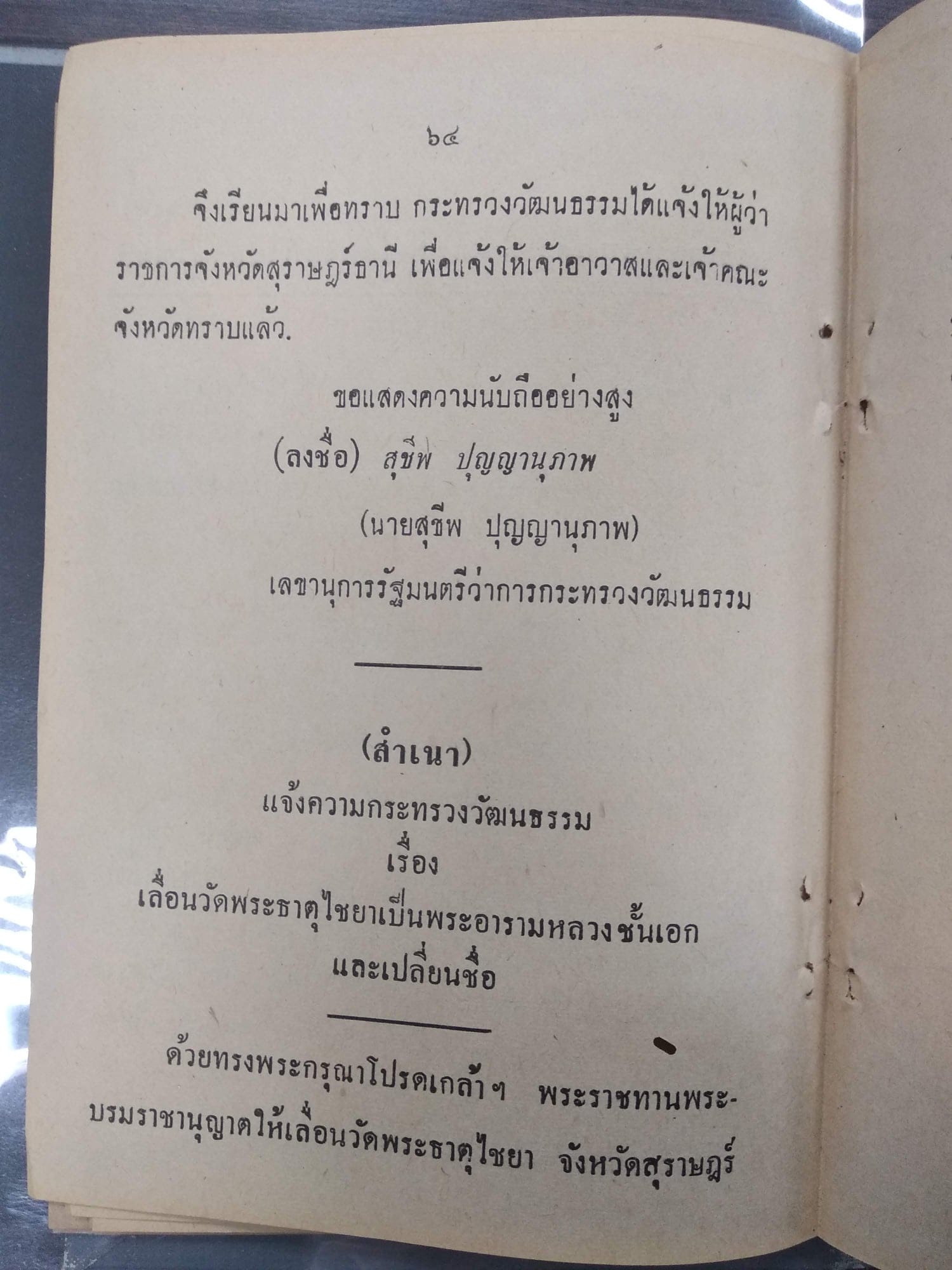 ข้อความข้างต้นนี้ คัดออกมาจากสมุดเยี่ยมที่มีอยู่ในสาขาพิพิธภัณฑ์แห่งชาติ ที่ตั้งอยู่ในวัดพระบรมธาตุไชยา ซึ่งได้บันทึกคำประณิธานนี้ลงไว้ในสมุดเยี่ยมนั้นเมื่อวันที่ ๑๕ กุมภาพันธ์ ๒๔๙๐ ครั้นต่อมาเมื่อวันที่ ๑๐ ตุลาคม ๒๔๙๐ ก็เริ่มดำเนินการมีหนังสือเป็นทางการขอพระราชทานพระบรมราชานุญาตยกฐานะวัดพระบรมธาตุไชยา กับวัดธรรมบูชาที่อำเภอเมืองสุราษฎร์ธานี ซึ่งเป็นวัดราษฎร์ทั้ง ๒ วัดขึ้นเป็นพระอารามหลวง #วัดพระบรมธาตุไชยาเป็นวัดฝ่ายมหานิกาย วัดธรรมบูชาเป็นวัดฝ่ายธรรมยุต ในที่สุดได้มีแจ้งความกระทรวงศึกษาธิการลงวันที่ ๑๕ มิถุนายน ๒๔๙๐ แจ้งให้ทราบว่าได้ทรงพระกรุณาโปรดเกล้าฯ ให้ยกฐานะของวัดทั้ง ๒ ดังกล่าวขึ้นเป็นพระอารามหลวง…