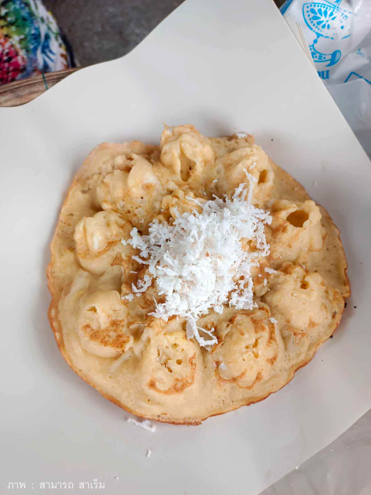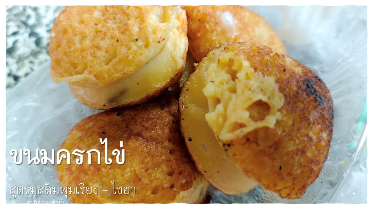 ๔.ขนมครกไข่ ที่ตลาดเช้าบ้านพุมเรียง ตำบลพุมเรียง อำเภอไชยา จังหวัดสุราษฎร์ธานี ตลาดเล็ก ๆ แต่เต็มไปด้วยของขายหลากหลายคนที่สนใจเรื่องวัฒนธรรมการกินหากมีโอกาสได้มาเยือนเมืองไชยา ก็ขอเชิญชวนให้มาที่นี่กันครับ เพราะมีขนมพื้นบ้านหลากหลายมาก ผู้เขียนได้ลิ้มลองขนมครกที่พิเศษใส่ไข่นี้ โดยคนมุสลิมพุมเรียงเจ้าของสูตรจะเรียกว่า “ขนมครกไข่” เพราะต่อยอดมาจากขนมครกธรรมดา(ตามข้อหนึ่ง) แต่เพิ่มไข่ไก่ลงไปในเนื้อแป้ง