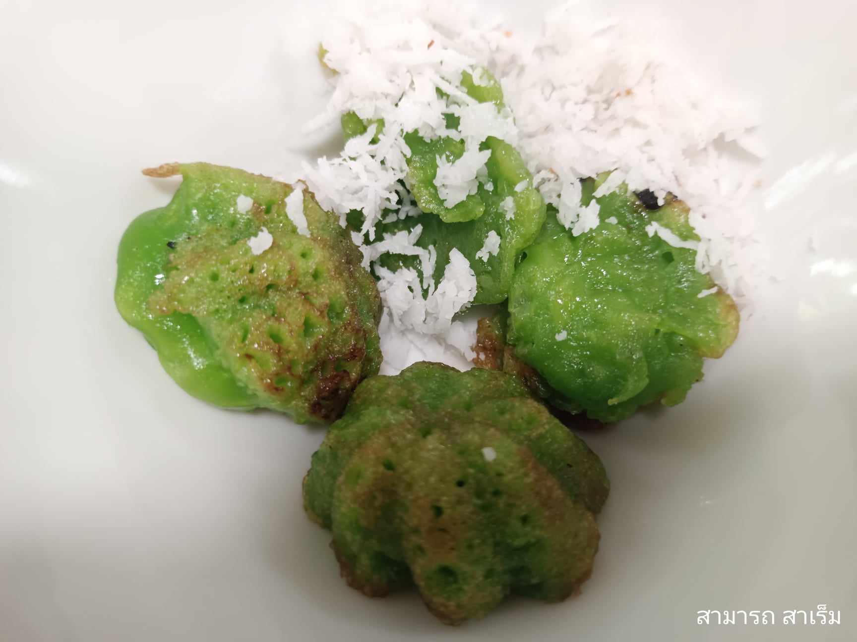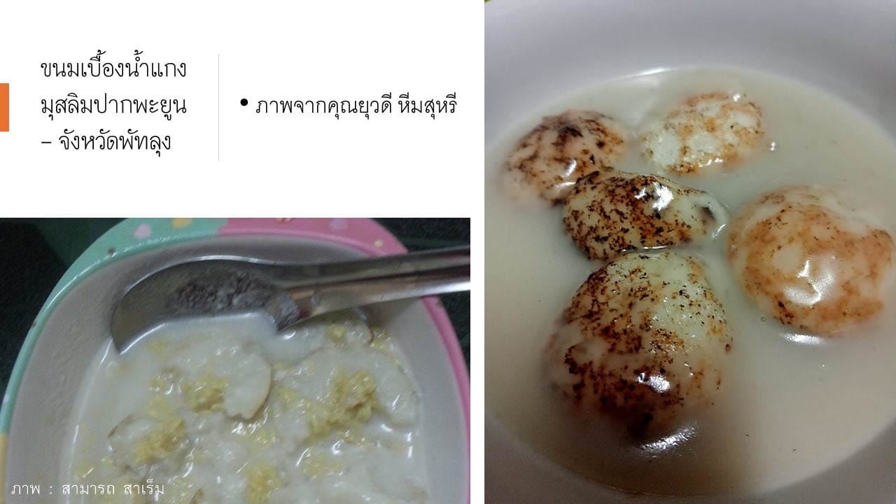 ข) ขีเขียวขนมรางของมุสลิมพุมเรียงซึ่งที่อื่นเรียกว่าขนมครกสิงขโป ซ) ขนมรางของมุสลิมสงขลาบางหมู่บ้านเรียกขนมลูกโดนหรือขนมดอกโดน