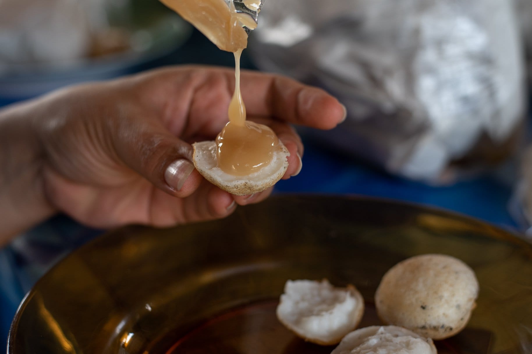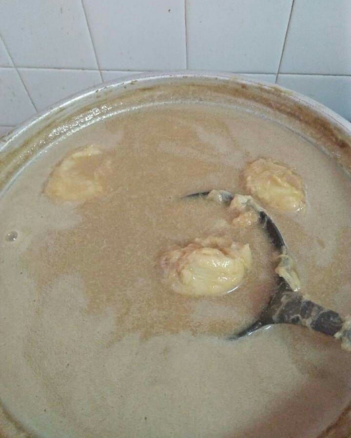 kuih serabi serawa durian ขนมครกกินกับน้ำแกงทุเรียนซึ่งเรียกภาษามลายูว่า เสอราวา ดูเรียน ที่รัฐเซิมบีลันประเทศมาเลเซีย (ภาพและข้อมูลจาก : https://www.facebook.com/permalink.php?story_fbid=pfbid02x6o4DzwBZbTW66ytKaLRHEpysJjv249GxbmeFvJKNjtLS6eypxasU83yABw2jeACl&id=3730446977119946 )