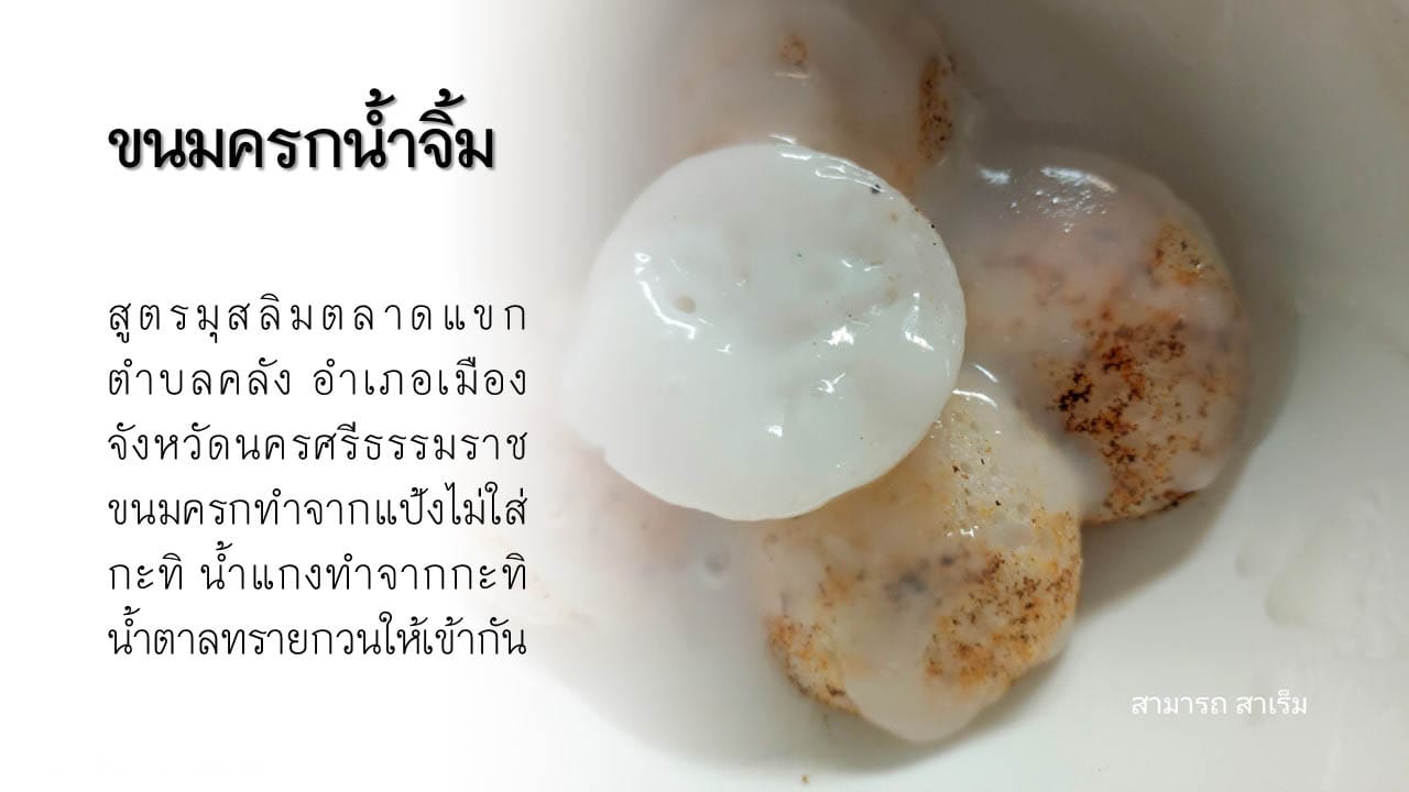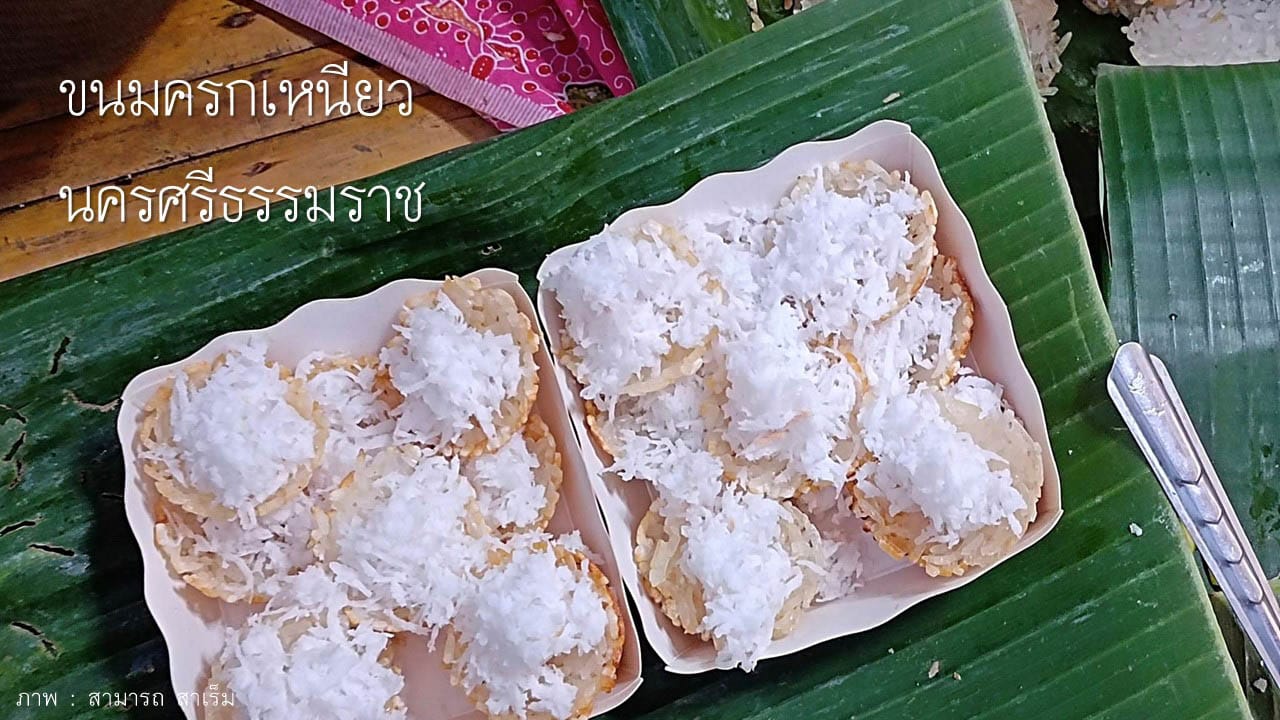 ๓.ขนมครกเหนียว หรือ ขนมครกข้าวสารเหนียว ผู้เขียนได้กินครั้งแรกที่จังหวัดนครศรีธรรมราชไม่เคยพบที่ใดมาก่อนซึ่งจะเรียกว่าขนมครกไม่เรียกขนมเบื้องเหมือนคนในลุ่มน้ำทะเลสาบสงขลา(สงขลา – พัทลุง) มีวัตถุดิบหลักตามชื่อเรียกคือ “ข้าวสารเหนียว” กินคู่กับมะพร้าวทึนทึกผสมน้ำตาลทรายและเกลือเล็กน้อย มีวิธีการทำที่ไม่ยุ่งยากนัก คือนำข้าวสารเหนียวแช่น้ำเปล่าเพื่อให้เม็ดข้าวสารเหนียวอมน้ำจนพอง ตั้งรางขนมครกบนไฟให้ร้อน แล้วตักข้าวสารเหนียวใส่ลงไปในหลุมขนมครก ขั้นตอนนี้เป็นขั้นตอนสำคัญ โดยจะต้องกะปริมาณข้าวสารเหนียวให้พอดีกับขนาดของหลุม เกลี่ยให้บางตามรูปทรงของหลุม