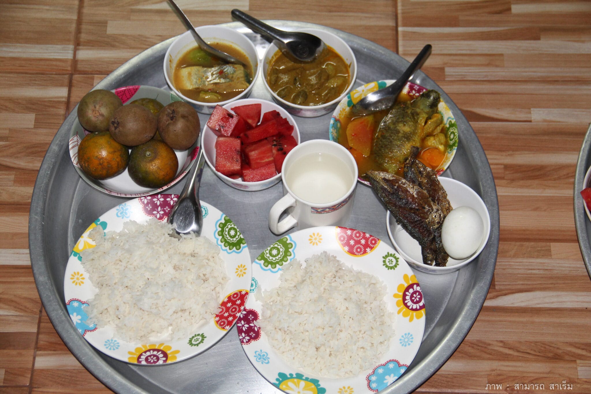 อาหารที่จัดสำรับในถาดเพื่อใช้ทำบุญพบว่ามีความหลากหลายของเมนูอาหาร แตกต่างกันไปในแต่ละครอบครัว ขึ้นอยู่กับความพร้อม แต่มีทำเนียมการจัดสำรับที่เหมือนกันคือจะต้องมีทั้งอาหารคาว ของหวาน และผลไม้ ในหนึ่งถาดจึงประกอบไปด้วย ข้าวเปล่า ๒ จาน แกงอาจจะเป็นแกงปลา ไก่ หรือเนื้อ ปลาทอด น้ำพริก ผักต่างๆ ส่วนผลไม้เช่นแตงโม กล้วย ส้ม และมีน้ำเปล่าใส่ในแก้วด้วย