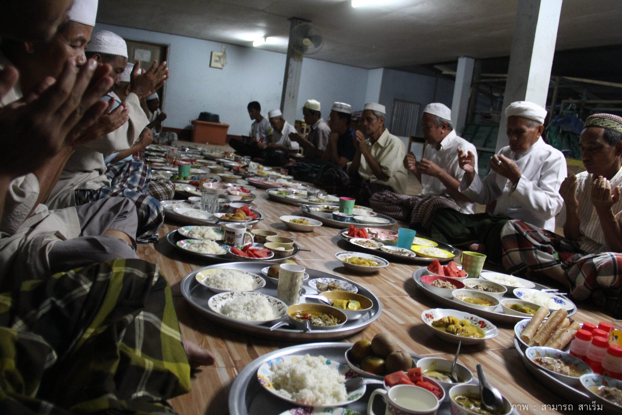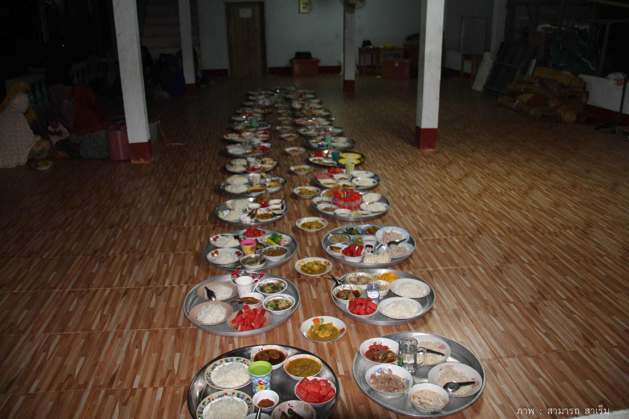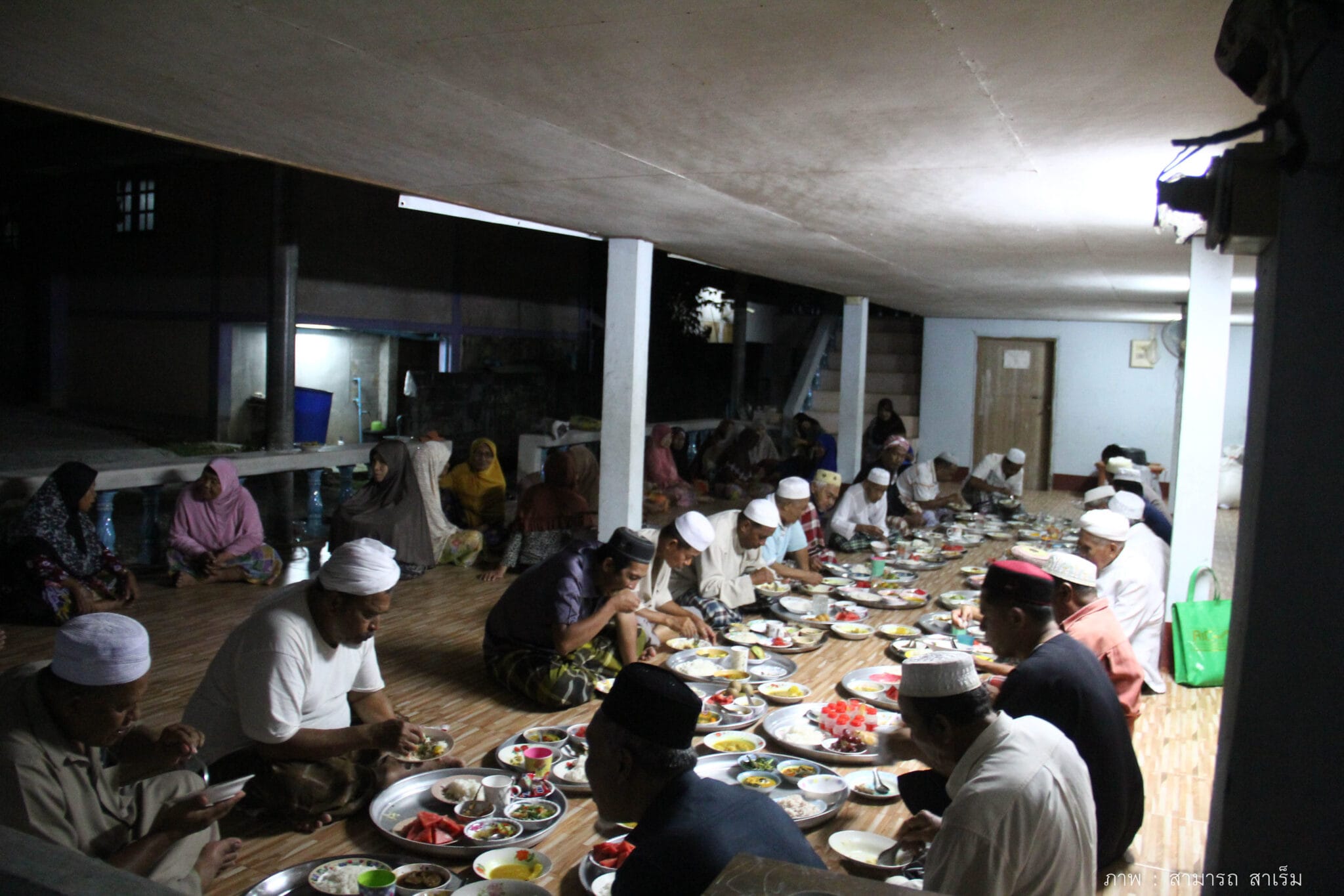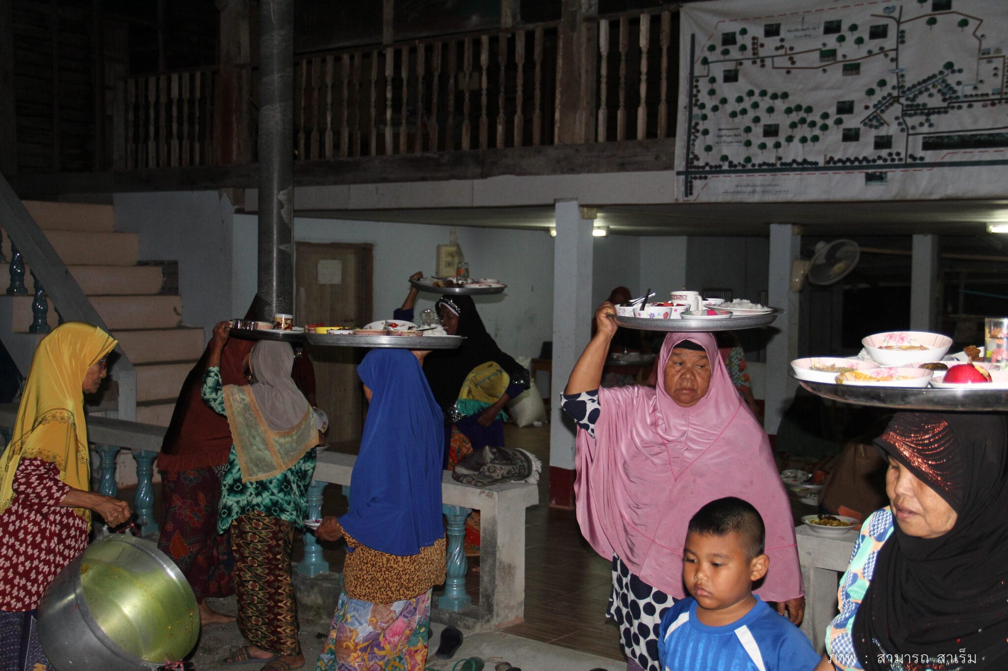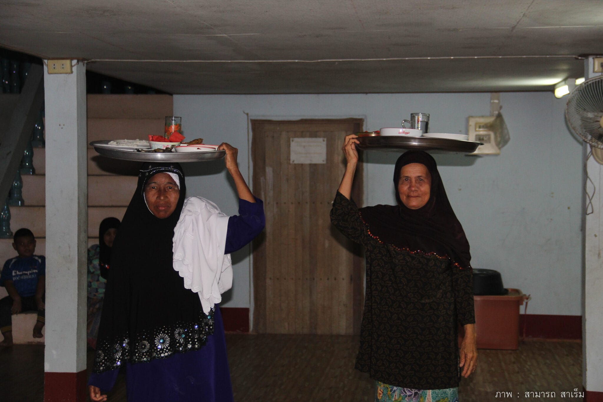 เมื่อใกล้ถึงเวลาละหมาดกลางคืน (วักตูอีฉา) เวลาประมาณ ๑๙.๓๐ นาฬิกา ชาวบ้านผู้หญิงส่วนใหญ่คือผู้สูงอายุจะทูนสำรับอาหารที่จัดใส่ถาดมาที่มัสยิด ส่วนกลุ่มบ้านย่อยที่อยู่ใกล้บาลายจะทูนไปที่บาลาย ผู้เขียนได้ร่วมพิธีที่มัสยิดแต่ระหว่างทางเดินไปมัสยิดได้ผ่านทางบาลาย จึงมีโอกาสเจอกับพี่สาววัยกลางคนใบหน้ายิ้มแย้มบนศรีษะกำลังทูนถาดสำรับอาหารมาที่บาลาย จึงได้หยุดพูดคุยและขอบันทึกภาพไว้ แล้วเดินต่อมาที่มัสยิดพบว่าชาวบ้านนำถาดสำรับอาหารมาตั้งไว้ที่ใต้ถุนของสุเหร่าจัดวางไว้อย่างเป็นระเบียบเพื่อรอเวลาทำพิธีแล้วเช่นเดียวกัน โดยจะทำหลังจากละหมาดอีฉาเสร็จ