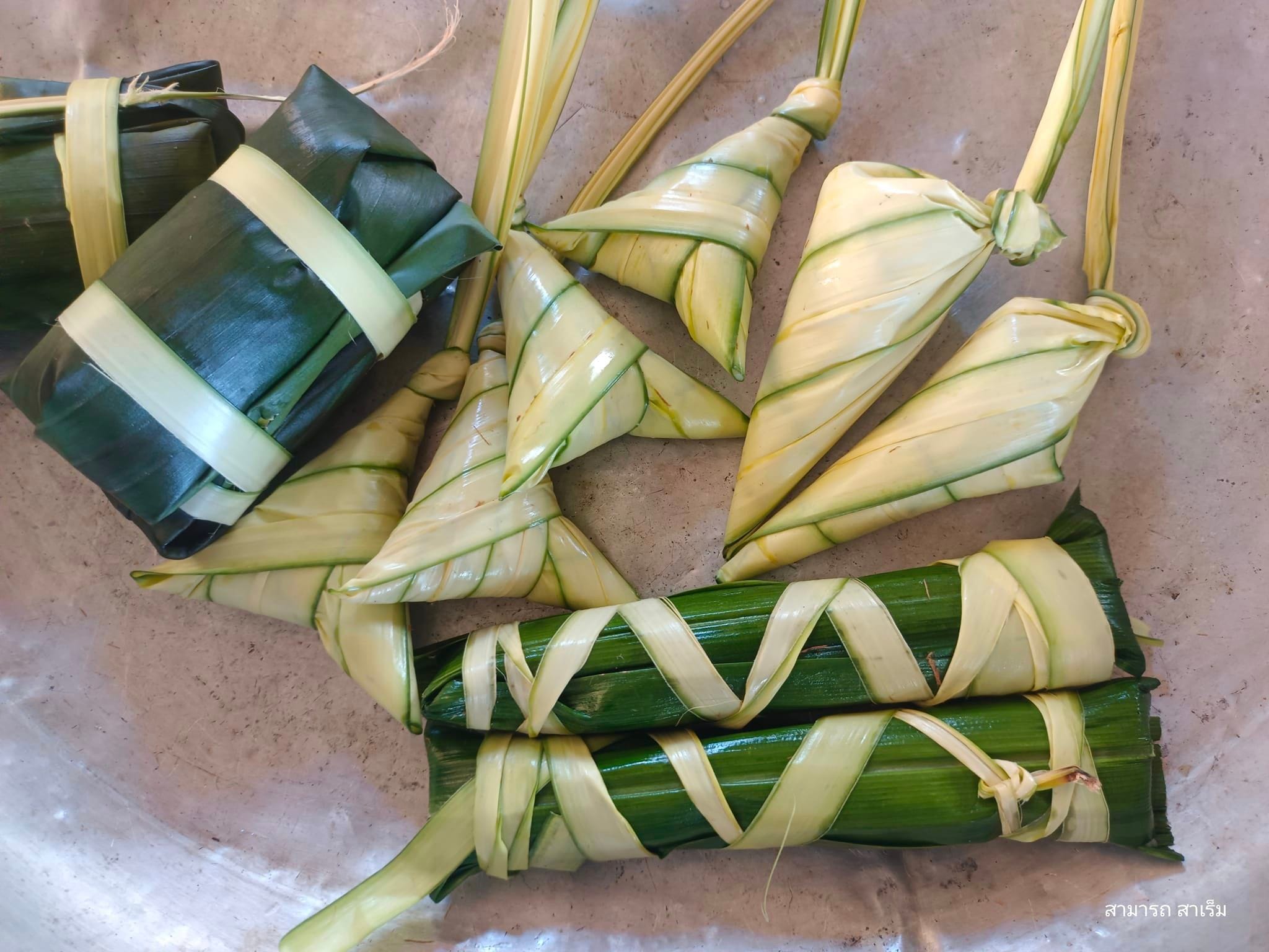 แล้วตักใส่ถาดตั้งให้เย็น หลังจากนั้นถึงขั้นตอนสำคัญคือ #การแทงต้ม นำใบพ้อที่แทงรังไว้มาคลี่ออกแล้วพับส่วนปลายให้เป็นกรวย นำมือจุ่มลงไปในน้ำแล้วหยิบข้าวเหนียว ใส่ลงไป ทำการม้วนและพับให้มิดชิดมัดปมข้างบน เป็นอันเสร็จ วะ เล่าว่า ตอนที่ท่านยังเป็นเด็ก ญาติผู้ใหญ่จะให้ลูกหลานได้ฝึกทำต้มกันโดย”…ใช้กากพร้าวมาฝึกทำ ….เด็กสมัยนี้ไม่สนใจเรื่องทำต้มกันแบบเด็กแตเเรก…”