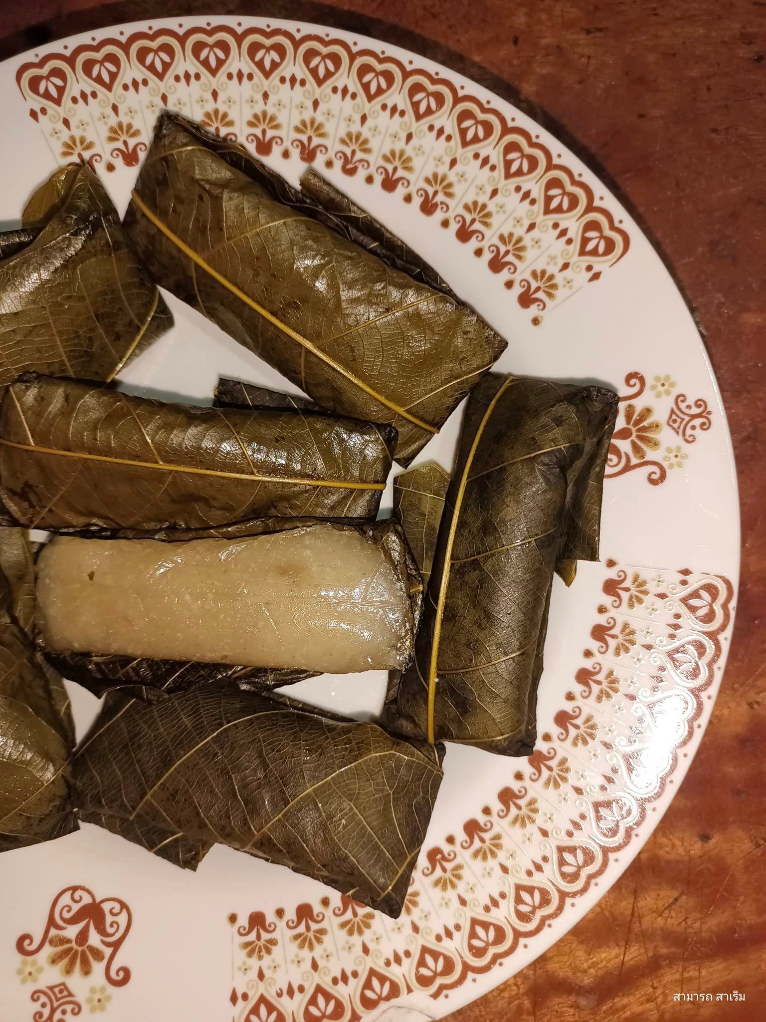 “…แถบสุไหงปาดีขนมเทียนวิธีการห่อเช่นเดียวกันแต่มีหลายสูตร ตัวแป้งนอกจากใช้แป้งข้าวเหนียวแล้วแม่ผมเคยใช้แป้งกลอย ได้ขนมสีเหลือง กลิ่นสัมผัสน่ากินไปอีกแบบ มีใส่มะพร้าวอ่อนขูด ตัวน้ำตาลมีหลากหลาย เช่นน้ำตาลทรายเคี่ยว น้ำตาลเเว่นเคี่ยวแป้งกลอยเป็นการบริหารจัดการกลอยที่เหลือกินครับ เมื่อเเช่กลอยจนได้กลอยจืดแล้ว ก็นำไปนึ่งกินกับข้าวเหนียว กลอยที่เหลือนึ่งหลายวันไปจะเปื่อยยุ่ยจนมีลักษณะเหมือนแป้ง นำมาผสมกับแป้งข้าวเหนียวเติมน้ำตาลเคี่ยว ห่อนึ่งได้ขนุมเทียนกลอย ได้เนื้อสัมผัสเนื้อกลอยด้วย…”