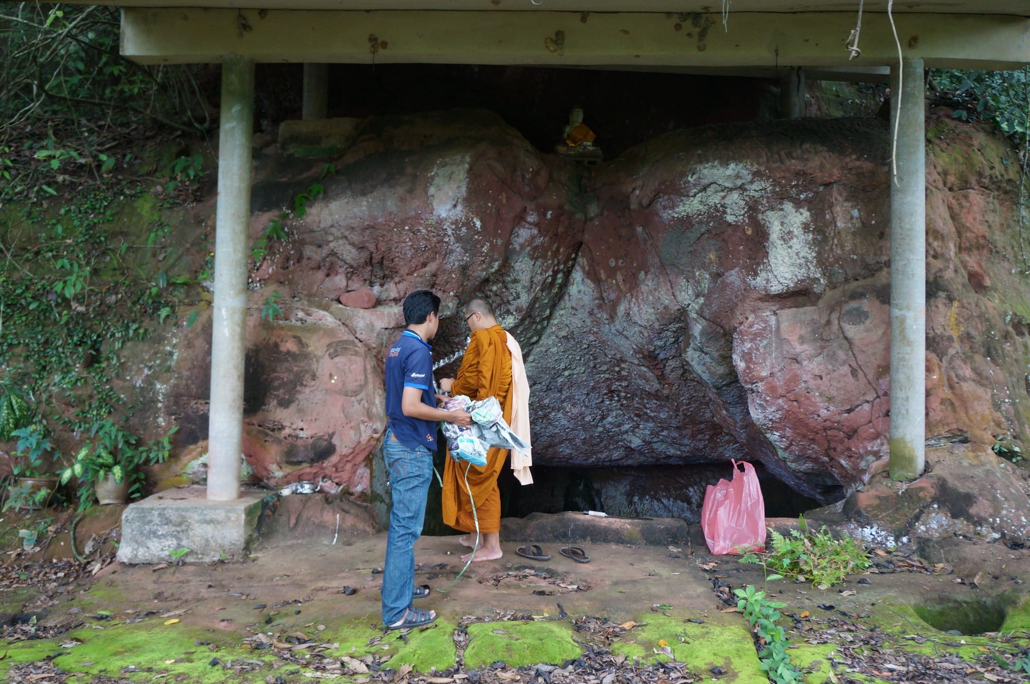 ถ้ำเขาหัวช้าง อยู่ปลายหางของเทือกเขานางเอ ไชยา มีสถานที่ที่เรียกกัน 2 อย่าง คือถ้ำเขาหัวช้าง เป็นชะง่อนผาหินทรายแดงที่ขุดตัดเข้าไปเป็นถ้ำสี่เหลี่ยมผืนผ้า มีเรื่องเล่าว่าเคยเข้าไปได้ยาวจนกระทั่ง อ.พุทธทาสแสดงฤทธิ์ปิดไว้ น่าจะเป็นตำนานเดียวที่พูดถึงการใช้อิทธิปาฏิหาริย์ของ อ.พุทธทาส นอกจากอาเทสนา – อนุสาสนีปาฏิหาริย์ที่ท่านทำให้เห็นเนือง ๆ ในบันทึกของ อ.พุทธทาสช่วง 2480 – 2490 มีพูดถึงถ้ำนี้บ่อย ๆ เรียกตรงนี้ว่าปากสระ เคยพาคณะศึกษาแนวโบราณคดีมาฉันเช้า กินเช้าที่นี่อยู่สองสามครั้งด้วย