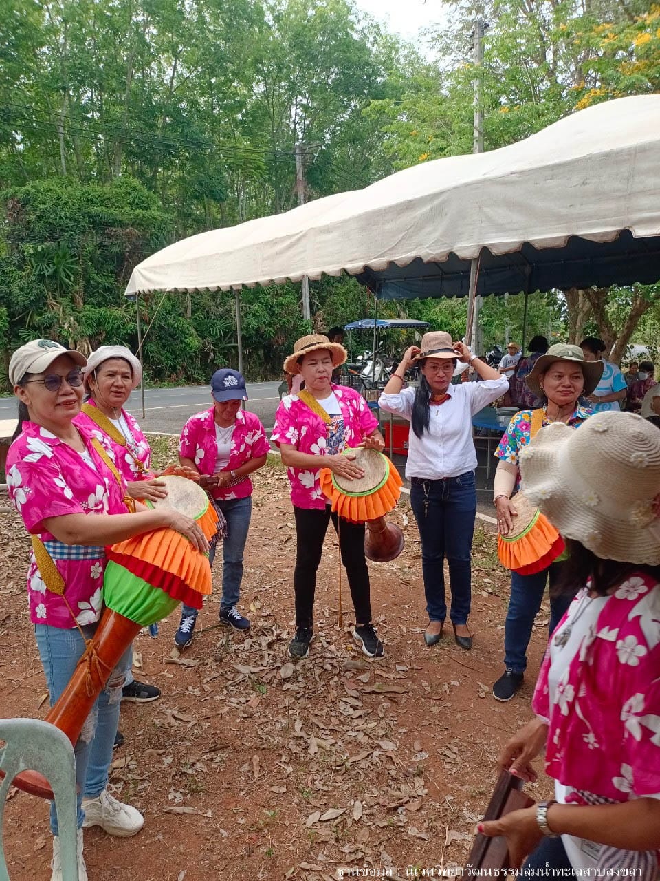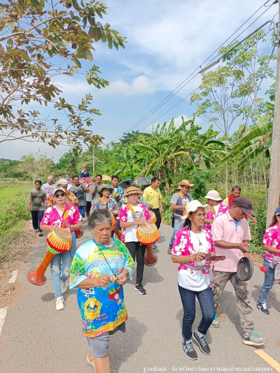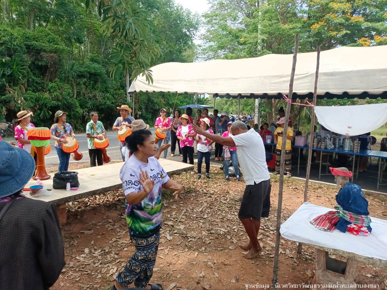 ก่อนถึงเวลาทำพิธีกรรมตอนสิบโมง ชาวบ้านทยอยกันมาเรื้อยๆพร้อมปิ่นโตคนละหนึ่งสาย แอดมินได้คุยกับคุณตาหัวหน้าคณะกลองยาว ท่านกำลังตระเตรียมกลองยาวให้พร้อมสำหรับใช้บรรเลงในขบวนแห่ทวดทอมในวันนี้ ท่านเล่าว่าการแห่ทวดทอมเพิ่งมีประมาณ ๑๐ ปี คณะกลองยาวของคุณตาเป็นคนในหมู่บ้านโดยเกือบทั้งหมดเป็นผู้หญิง