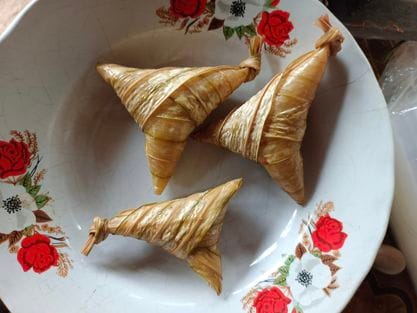 ๒.“ข้าวต้ม” ทำจากข้าวเหนียวแบบเดียวกับต้มแต่มีการเพิ่มกล้วยทำเป็นไส้เช่น กล้วยน้ำว้า กล้วยนางยา ใช้ใบตองห่อแทนใบกะพ้อแล้วนำมาปะกบกันสองชิ้น มัดด้วยเชือกกล้วยหรือวัสดุอื่น ๆ โดยทั่วไปนิยมมัดเพียงสองตำแหน่ง คือบริเวณค่อนไปทางส่วนปลายทั้งสองด้านของขนม นำไปต้มให้สุก เมื่อแกะออกมาจะได้ขนมที่มีลักษณะนูนคล้ายภูเขาสามลูก