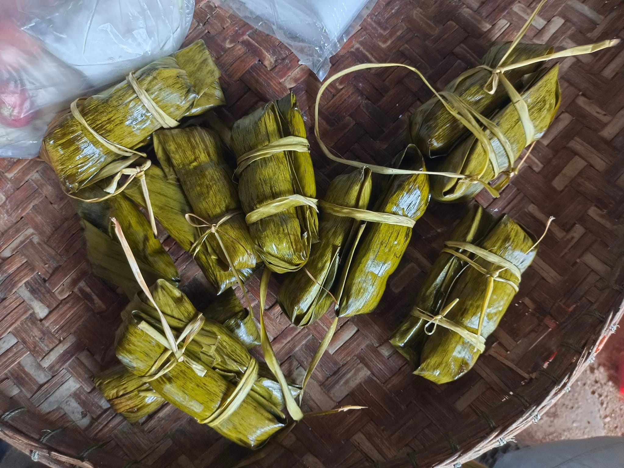 ๓.“ขนมเทียน” หรือ “ขนมห่อ” ทำจากแป้งข้าวเหนียวผสมฟักทองน้ำตาลทรายห่อด้วยใบกล้วยให้มีลักษณะเป็นสี่เหลี่ยมผืนผ้า[6] ขนมทั้งสามอย่างนี้ผู้เขียนพบว่าทุกบ้านที่ได้ไปสำรวจจะทำกัน