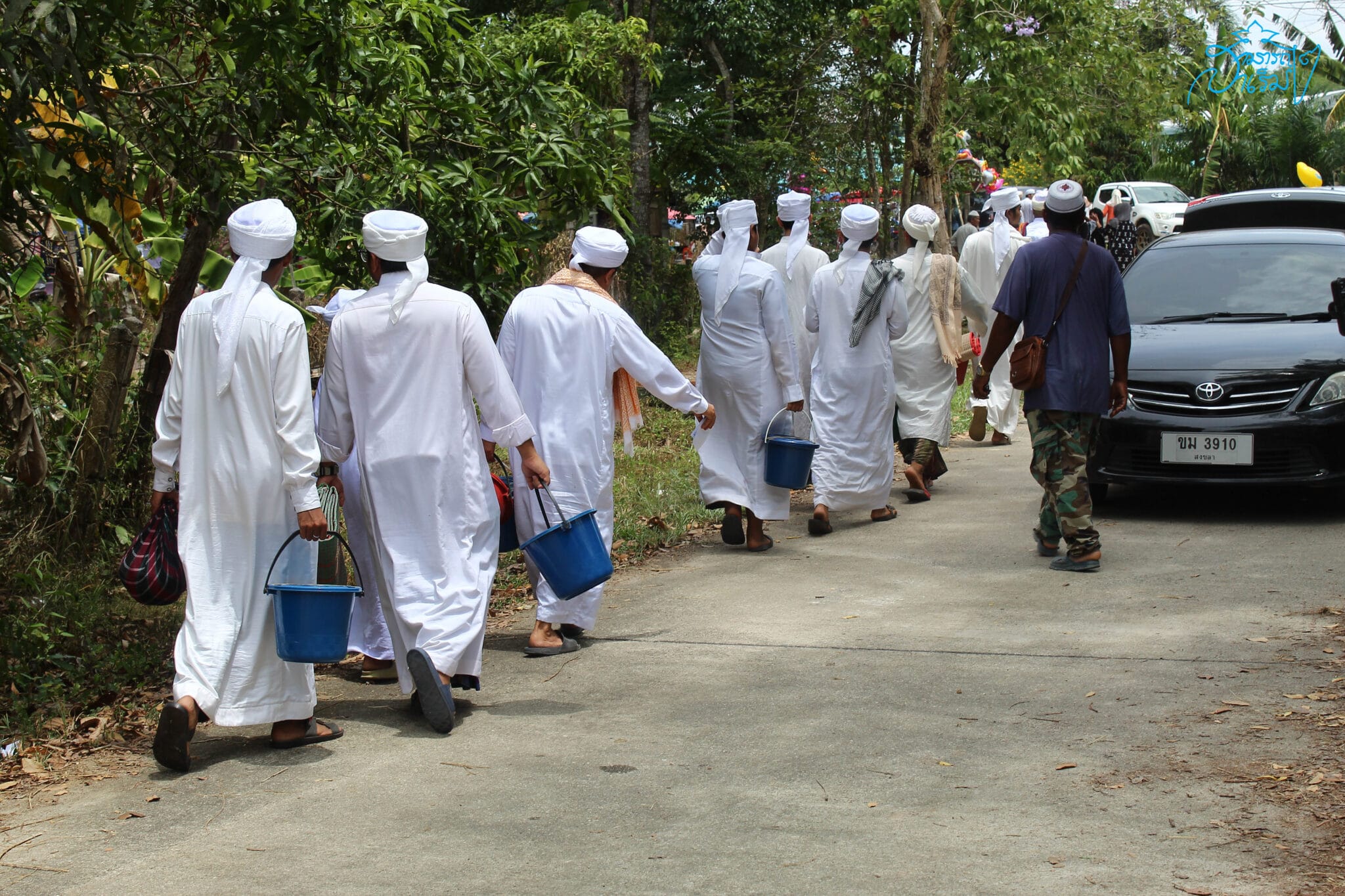 เมื่อจัดอาหารในพานเสร็จ ผู้ชายก็จะทำหน้าที่ยกไปตั้งเรียงไว้ที่ศาลาอีกหลังหนึ่ง ซึ่งเป็นพื้นที่ประกอบพิธีกุลลูฮุมและรับประทานร่วมกันของโต๊ะที่เชิญมา สำรับอาหารตั้งอยู่บนพานที่มีฝาชีครอบสีสันสดไสและลวดลายลายที่เป็นเอกลักษณ์ มองดูแล้วเป็นภาพที่งดงามเป็นอย่างมาก ใกล้กันจะมี “จาด” ซึ่งแต่ละครอบครัวนำมาด้วยตั้งอยู่ภายในเต้นท์ สำหรับปีนี้จาดมีทั้งหมด ๖๐๐ ถัง ซึ่งหลังจากโต๊ะรับประทานอาหารเสร็จแล้วจะมอบเป็นของชำรวยหรือของขวัญให้นำกลับไปบ้านด้วย