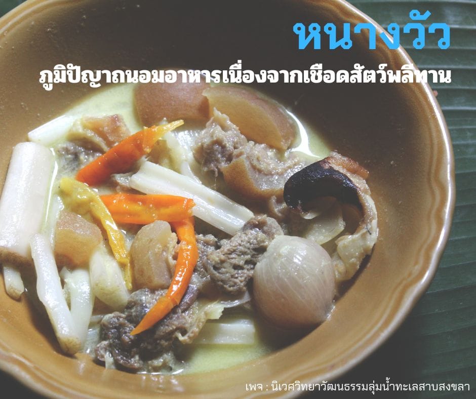 “หัววัว” เป็นส่วนที่ไม่นิยมรับประทานและไม่ได้ทิ้งคว้าง จะนำมาถนอมอาหารดองเปรี้ยว(ส้ม) เรียกว่า “ใส่หนาง” พจนานุกรมภาษาไทยถิ่นใต้ พุทธศักราช ๒๕๒๕ สถาบันทักษิณคดีศึกษา หน้า ๓๐๗ ให้ความหมายไว้ว่า “ก.ทำดองส้มใช้ในการดองส้มวัวหรือหมู” ถือได้ว่าเป็นภูมิปัญญาของผู้คนในภาคใต้ พบได้หลายพื้นที่ โดยคนไทย(นับถือพุทธ) ทำทั้งหนางวัวและหนางหมู ในขณะที่คนมุสลิมทำหนางวัวเพียงอย่างเดียวเพราะหมูเป็นสัตว์ต้องห้ามทางศาสนาอิสลาม