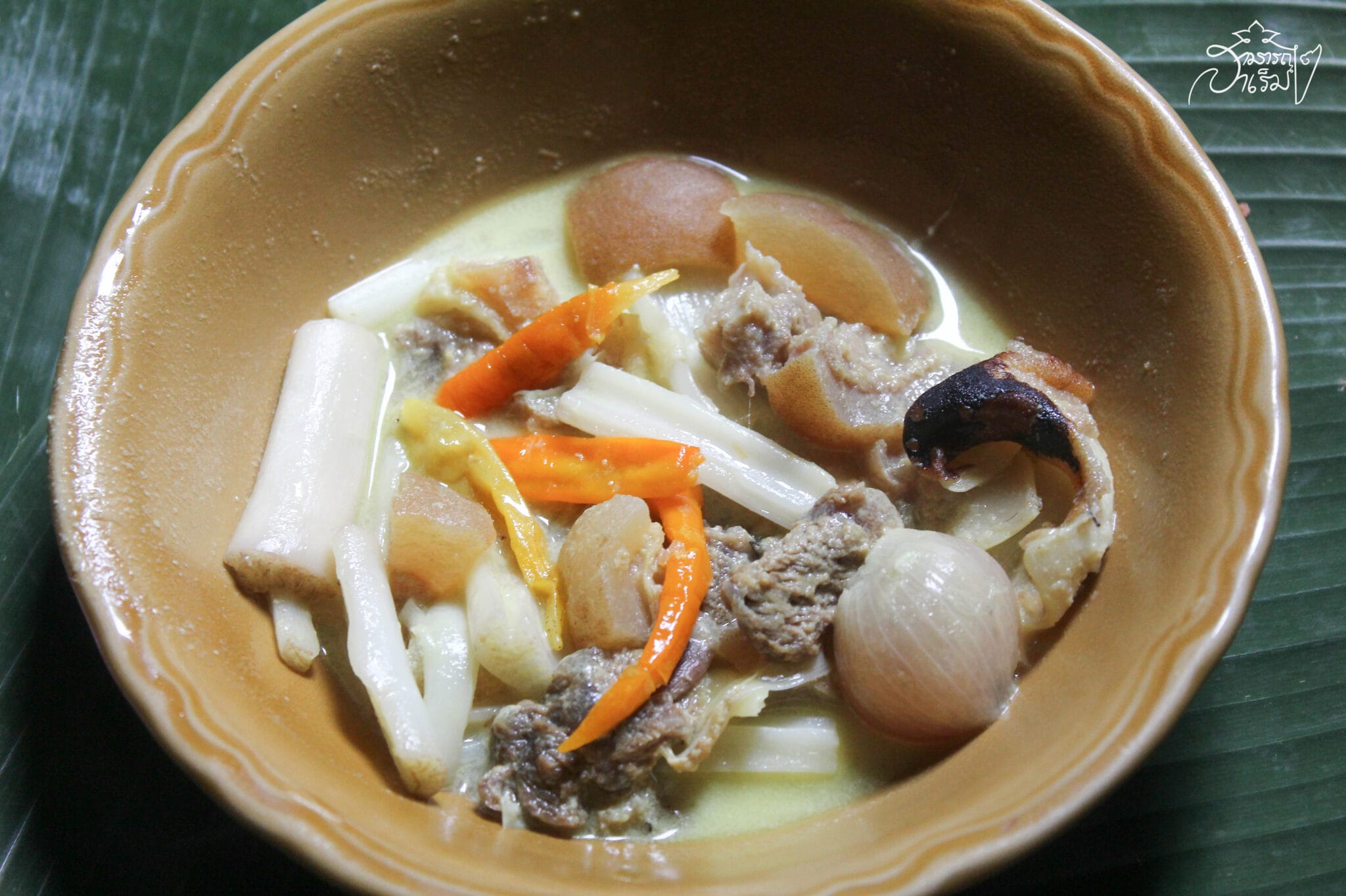 เริ่มต้นด้วยการนำหนางล้างกับน้ำเปล่าเพื่อลดความเปรี้ยวลง ใส่ตะกร้าตั้งให้เสด็จน้ำ แล้วตั้งน้ำกะทิบนเตาไฟ สำหรับวันนี้ผู้เขียนใช้เตาถ่านในการปรุงเพราะรสชาติจะออกมาอร่อยกว่าใช้เตาแก๊สมาก ตามด้วย ทุบหอมแดง ตะไคร้ กระเทียม ให้พอบุบ และซอยหัวข่าเป็นแผ่นบาง ๆ ใส่เครื่องสมุนไพรทั้งหมดข้างต้นลงไปในหม้อ