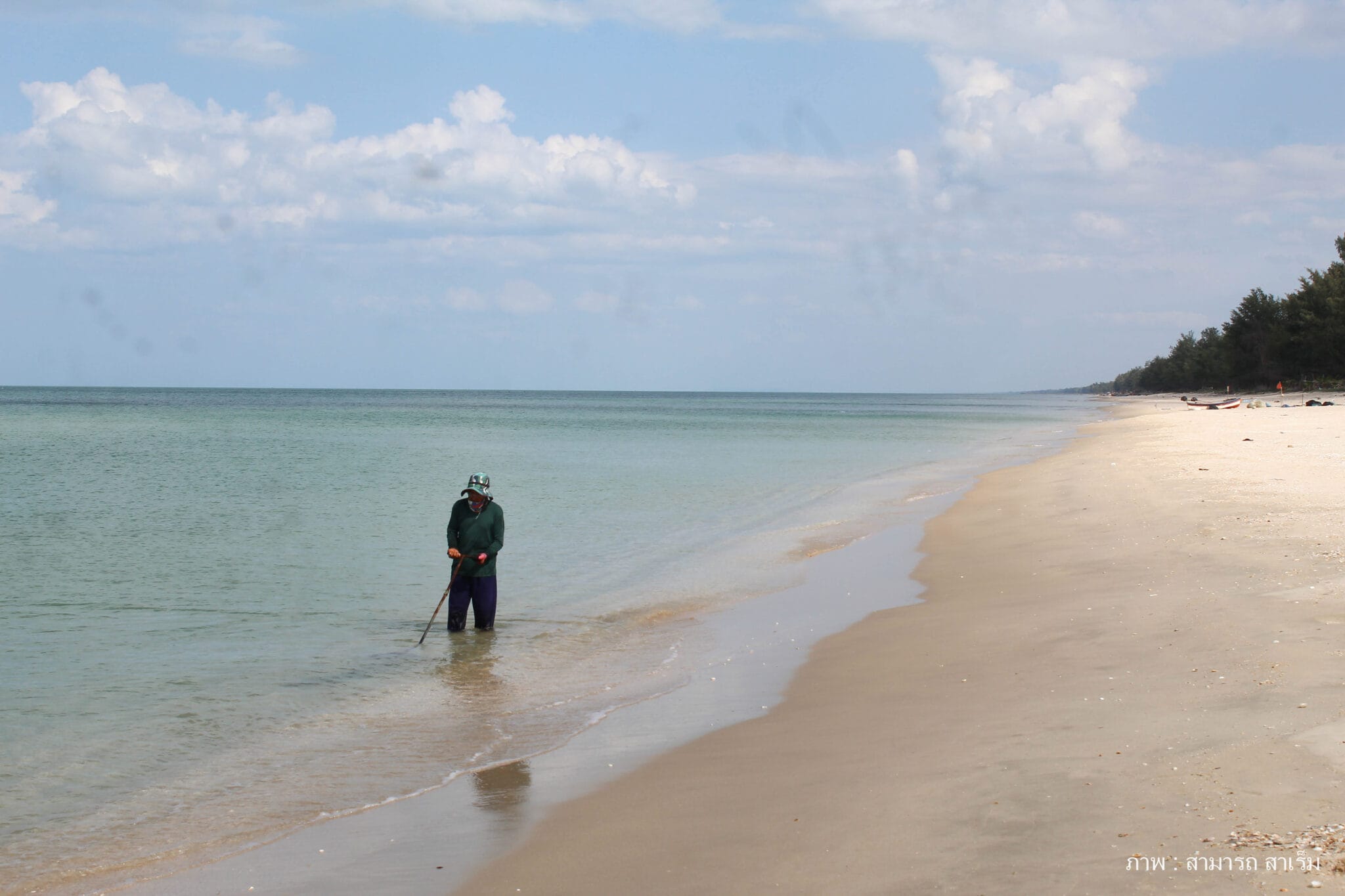โต๊ะชายหมาด (โต๊ะชาย แปลว่าตาหรือปู่) ผู้รับหน้าที่หาหอยเสียบก็ชวนผู้เขียนลงไปดูวิธีการลากหอยเสียบ โดยโต๊ะชายหมาดให้ข้อมูลเพิ่มเติมว่า ช่วงนี้ต้องระวังเป็นพิเศษเพราะเป็นช่วงที่มีแมงกระพุนพิษ ตอนลากต้องระวังไม่ให้โดนตัวและท่านเตือนว่าอย่าลงเล่นน้ำเด็ดขาด วิธีการหาเป็นไปตามที่ผู้เขียนเล่าไว้แล้วข้างต้น เมื่อลากได้จำนวนหนึ่งก็นำมาเทใส่กระสอบที่ปูรอไว้ริมทะเล เมื่อหาให้ได้จำนวนหนึ่งแล้วจึงนำกลับขึ้นไปช่วยกันเลือกอีกครั้ง