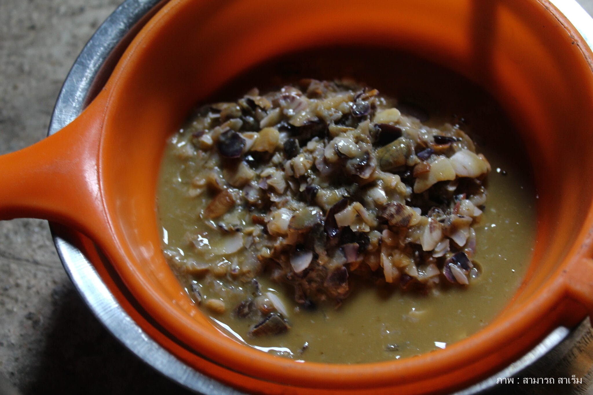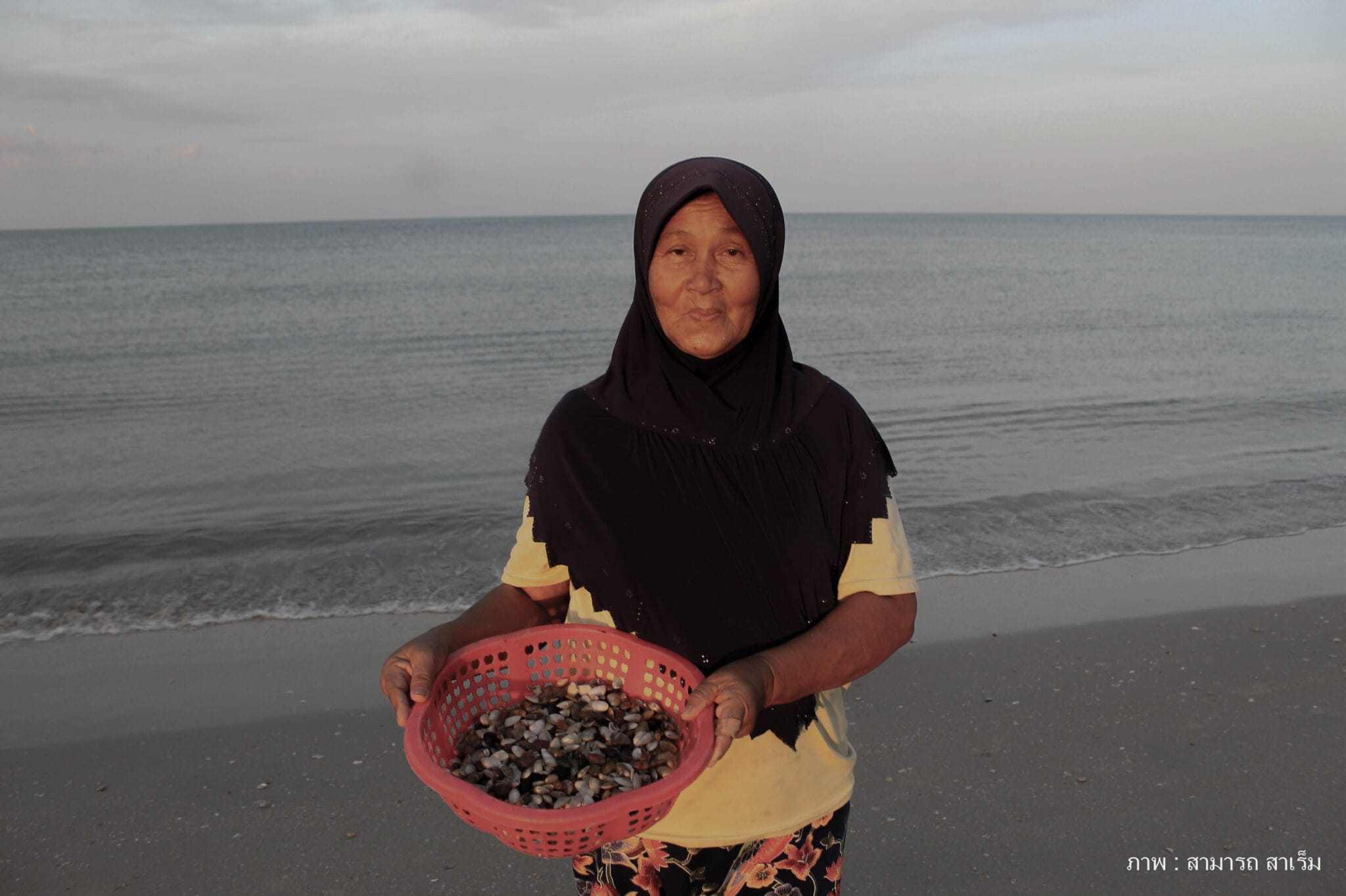 ส่วนผู้สูงอายุอีกท่านคือคุณยายจากบ้านดีหลวงอายุเกือบ ๙๐ ปีแล้ว ซึ่งเป็นคนไทยพุทธ ท่านเล่าว่า วันนี้ตั้งใจมาหาหอยเสียบริมทะเล พอดีมาเจอกับผู้สูงอายุสองสามีภรรยา ซึ่งบอกว่าไม่ต้องลงไปหาเพราะเดี๋ยวจะแบ่งหอยเสียบที่หาได้ให้คุณยายด้วย คุณยายจึงช่วยเลือกหอยเพื่อเป็นการตอบแทนน้ำใจ หอยเสียบที่ได้รับมานี้คุณยายตั้งใจจะนำไปทำเมนูที่เรียกว่า “น้ำเคยหอยเสียบ” เมื่อได้ยินผู้เขียนจึงตื่นเต้นมากเพราะว่าไม่เคยรู้มาก่อนว่าหอยเสียบสามารถทำเมนูนี้ได้ด้วย คุณยายเล่าว่า “นำหอยเสียบต้มกับเครื่องแกงเผ็ด” ทำง่าย ๆ เป็นของหรอยที่ทำให้กินข้าวได้มาก ถ้ารู้สึกเบื่อข้าวก็จะทำกิน พูดคุยกันออกรสชาติหอยที่เลือกอยู่ก็หมดลง