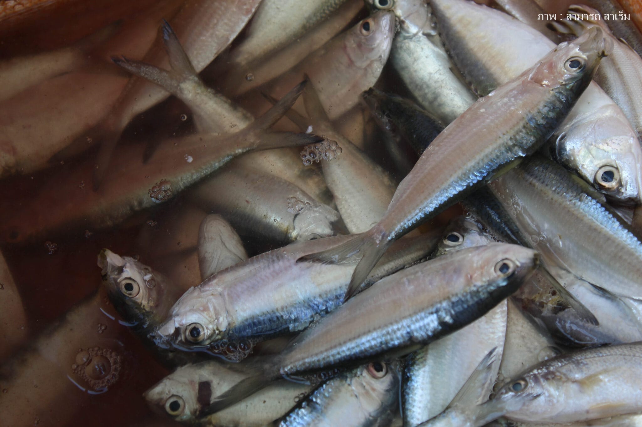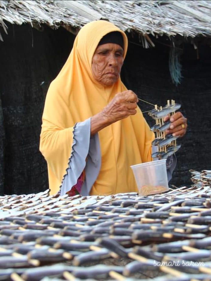 ปลาหลังเขียวแห้งเสียบไม้กำลังถูกมัดรวมตามจำนวนออเดอร์ที่ลูกค้าสั่งซื้อ โดยโต๊ะเซี๊ยะ ผู้สูงอายุแห่งบ้านชุมพลชายทะเล ชุมชนเล็ก ๆ ริมทะเลอ่าวไทย(เลออก)บนคาบสมุทรสทิงพระ