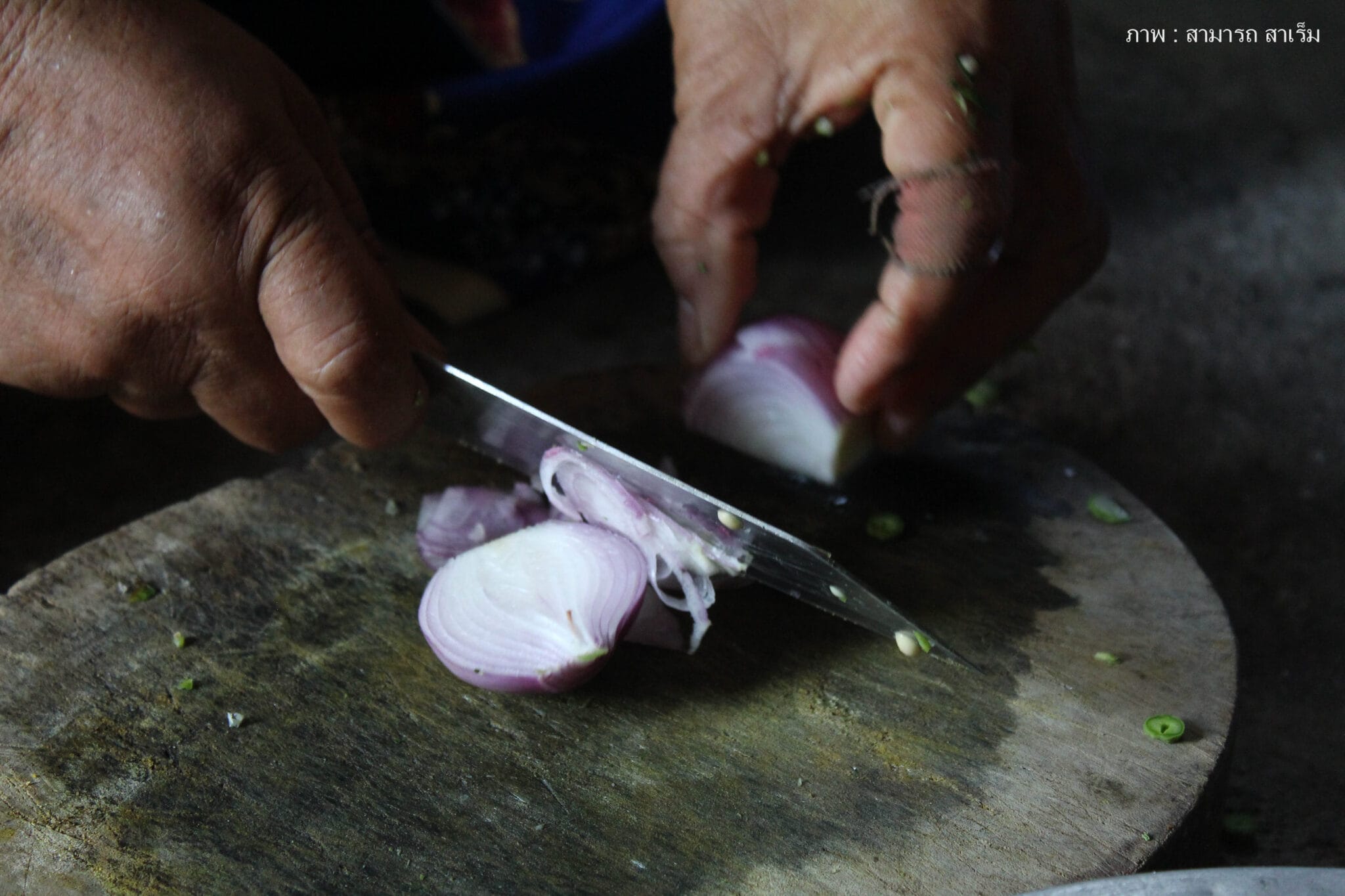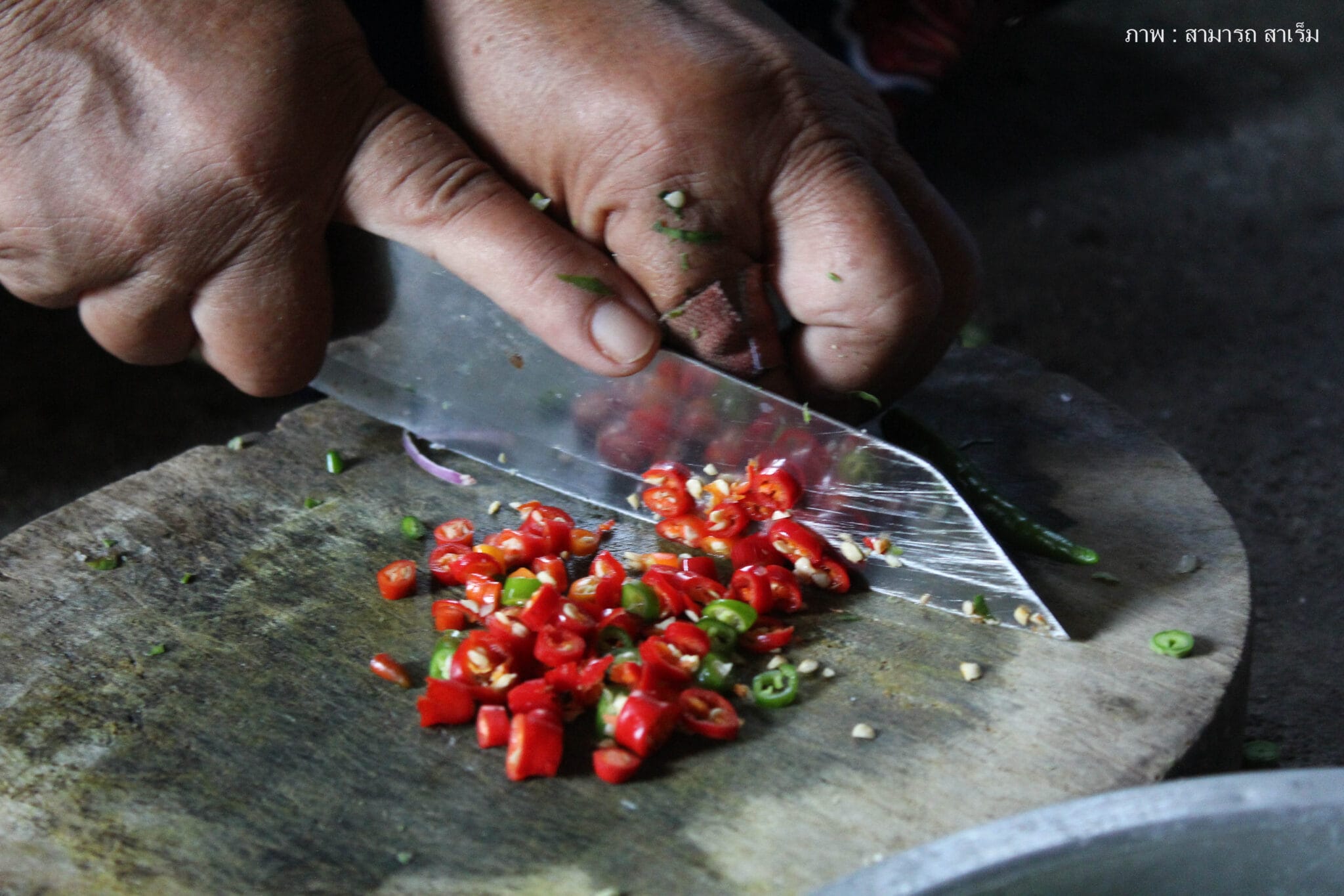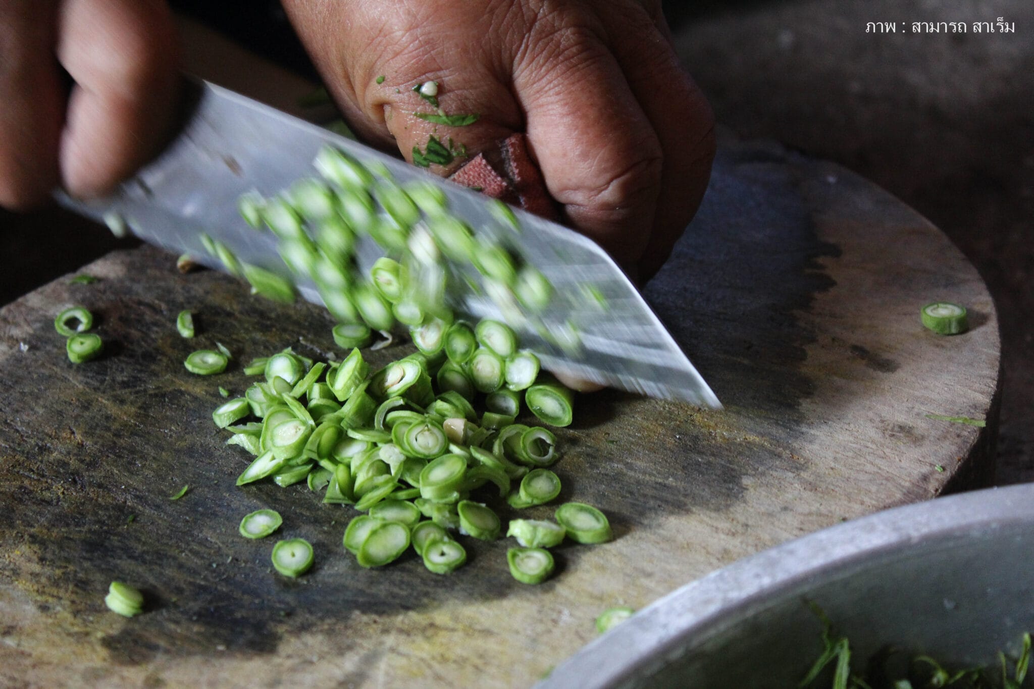 เมื่อสัปดาห์ที่ผ่านมาผู้เขียนมีโอกาสไปสำรวจภาคสนามที่บ้านหมู่บ้านแห่งนี้ จึงมีโอกาสได้ลิ้มลองเมนูหรอยอาหารพื้นถิ่นประจำฤดูกาล ที่ชื่อว่า “ยำปลาหลังเขียว” จากตำรับก้นครัวของ วะฉ๊ะ นางกีฉ๊ะ วงษ์อุทัย (วะคือป้า) คนมุสลิมที่เกิดและเติบโตในหมู่บ้านแห่งนี้ เรียนรู้สูตรอาหารจากมะ(แม่)ของท่าน เมื่อออกเรือนก็ทำหน้าที่เป็นแม่ครัวของสามีและลูก ๆ ในครั้งนี้วะฉ๊ะใจดีถ่ายทอดวิชาเกี่ยวกับอาหารชนิดนี้ให้อย่างละเอียด ซึ่งผู้เขียนมีส่วนร่วมในทุก ๆ ขั้นตอน ยกเว้นการหาปลาหลังเขียวเพราะเราซื้อมาจากเพื่อนบ้านที่เพิ่งจับขึ้นมาจากทะเลใหม่ เมนูนี้ต้องใช้ปลาสดเท่านั้นถึงจะอร่อย