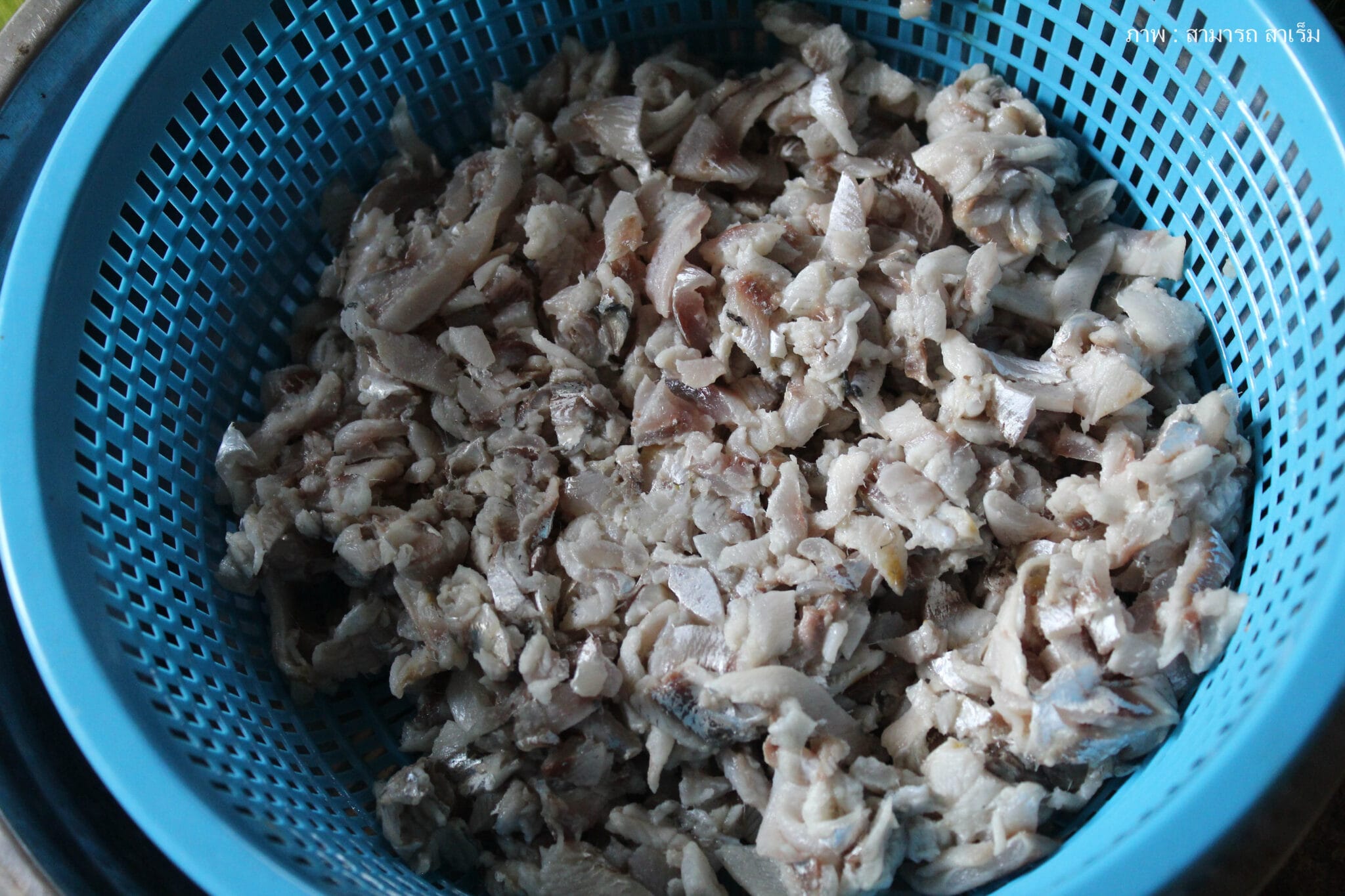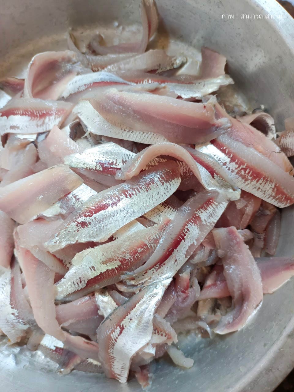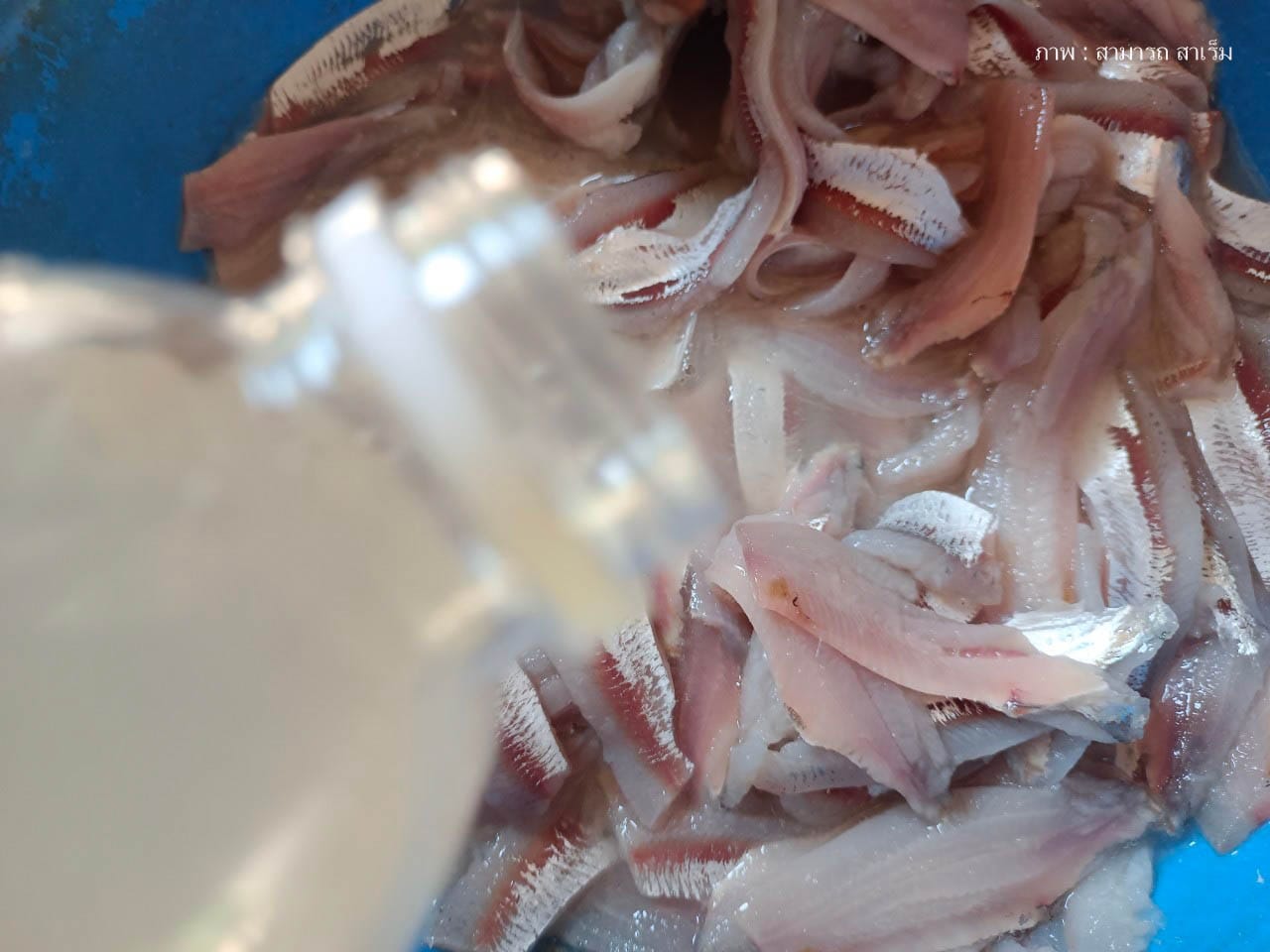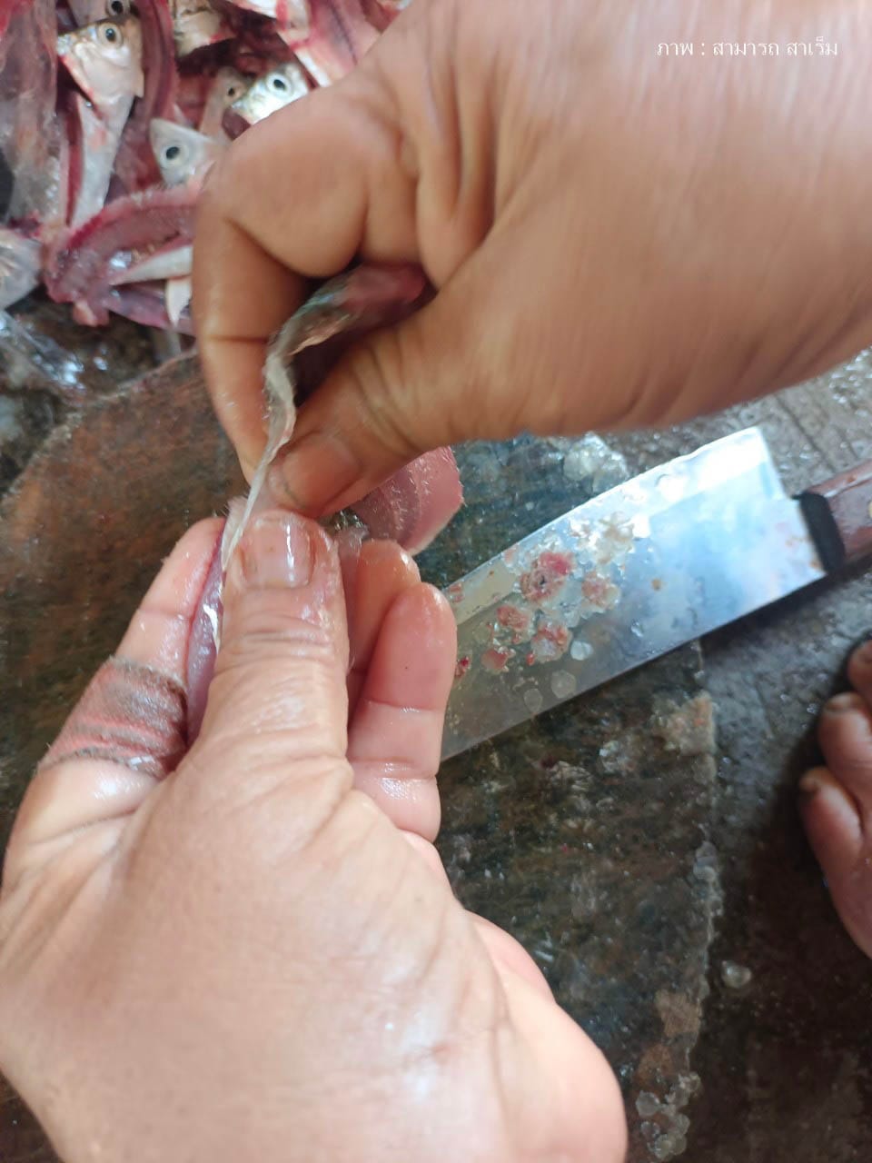 เมื่อได้ปลามาแล้วก็นำมาล้างให้สะอาด ตัดหัวกับท้องออกโดยไม่ต้องขูดเกล็ด แล้วแล่เนื้อปลาเอาก้างออกทั้งสองด้าน หนึ่งตัวจึงได้เนื้อปลาสองชิ้นมีคำเรียกท้องถิ่นว่า “แบก้างออก” แล้วจึงลอกหนังออก การที่ไม่ขูดเกล็ดปลาออกนั้นทำให้ลอกได้ง่ายกว่าแบบขูดเกล็ดออกเป็นองค์ความรู้ที่เกิดจากประสบการณ์ที่ถ่ายทอดสืบต่อกันมารวมถึงต้องไม่มีการนำมาปลามาดอง(แช่)น้ำเเข็งด้วย