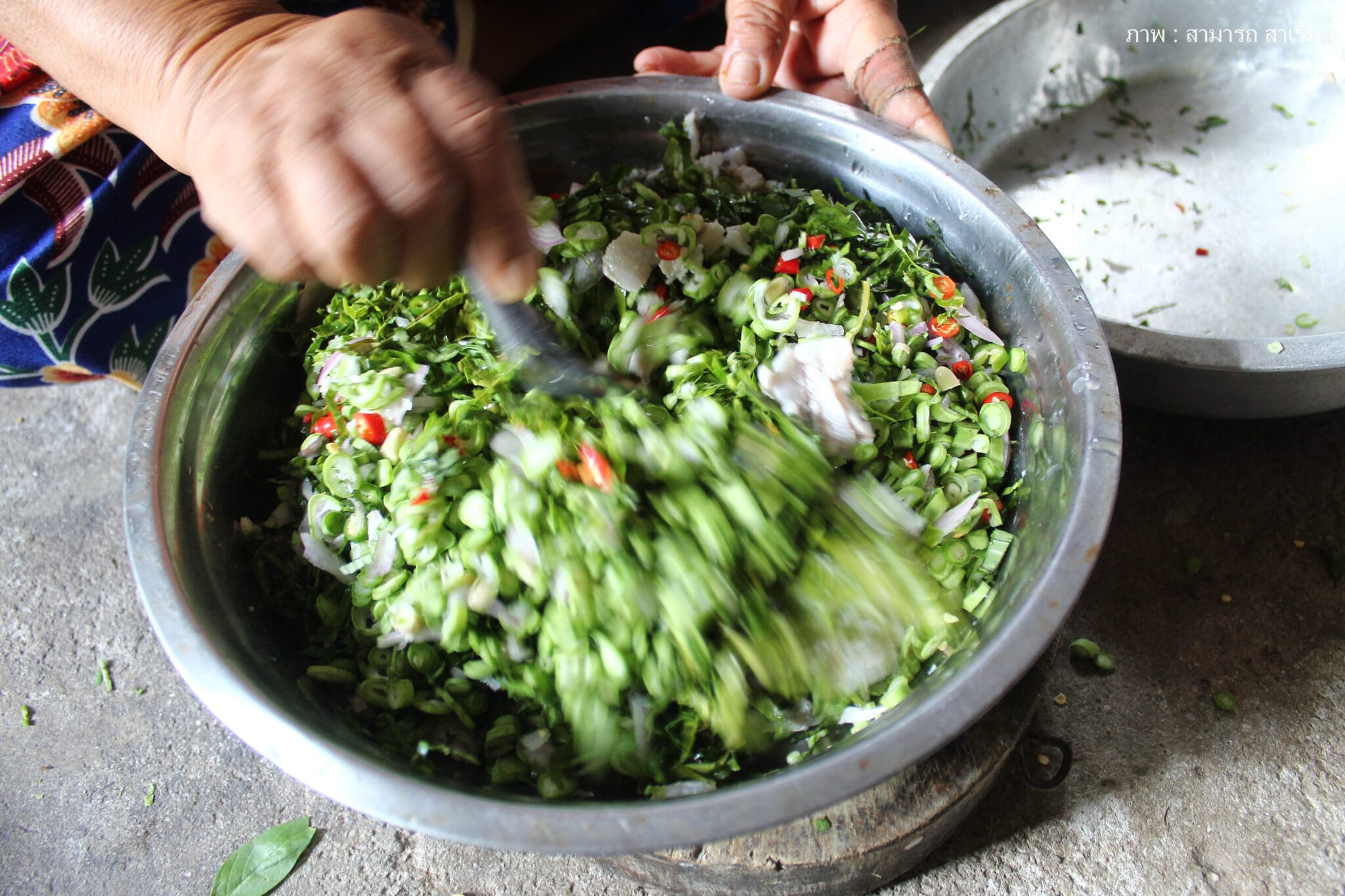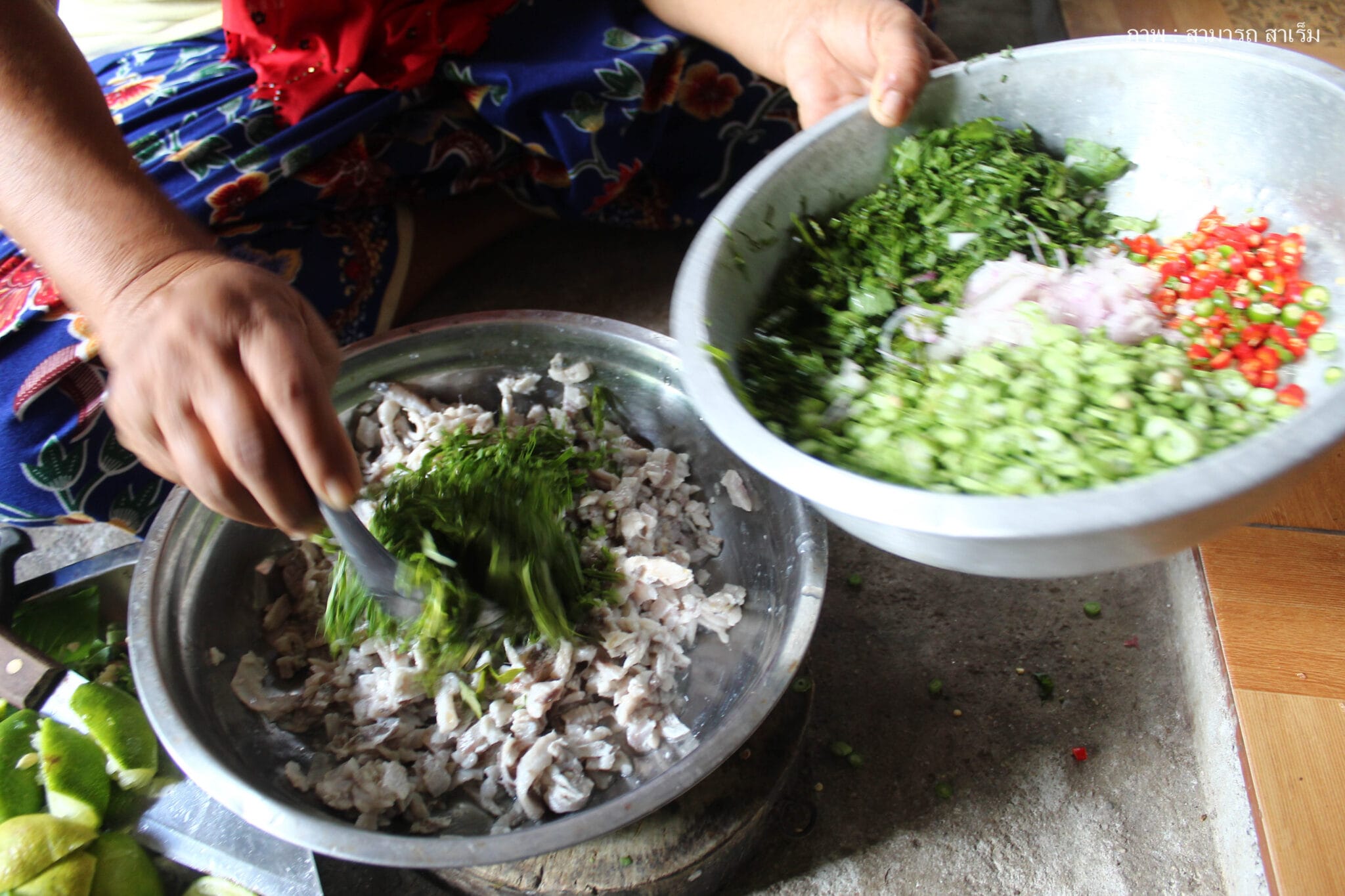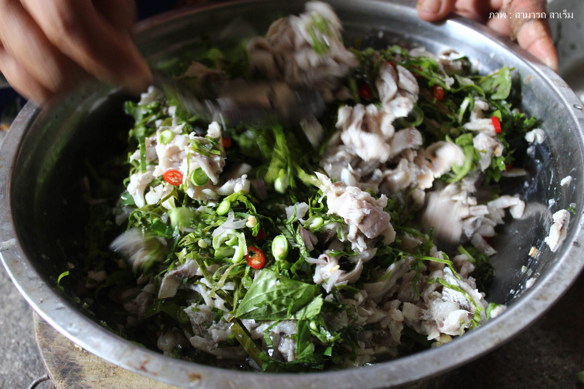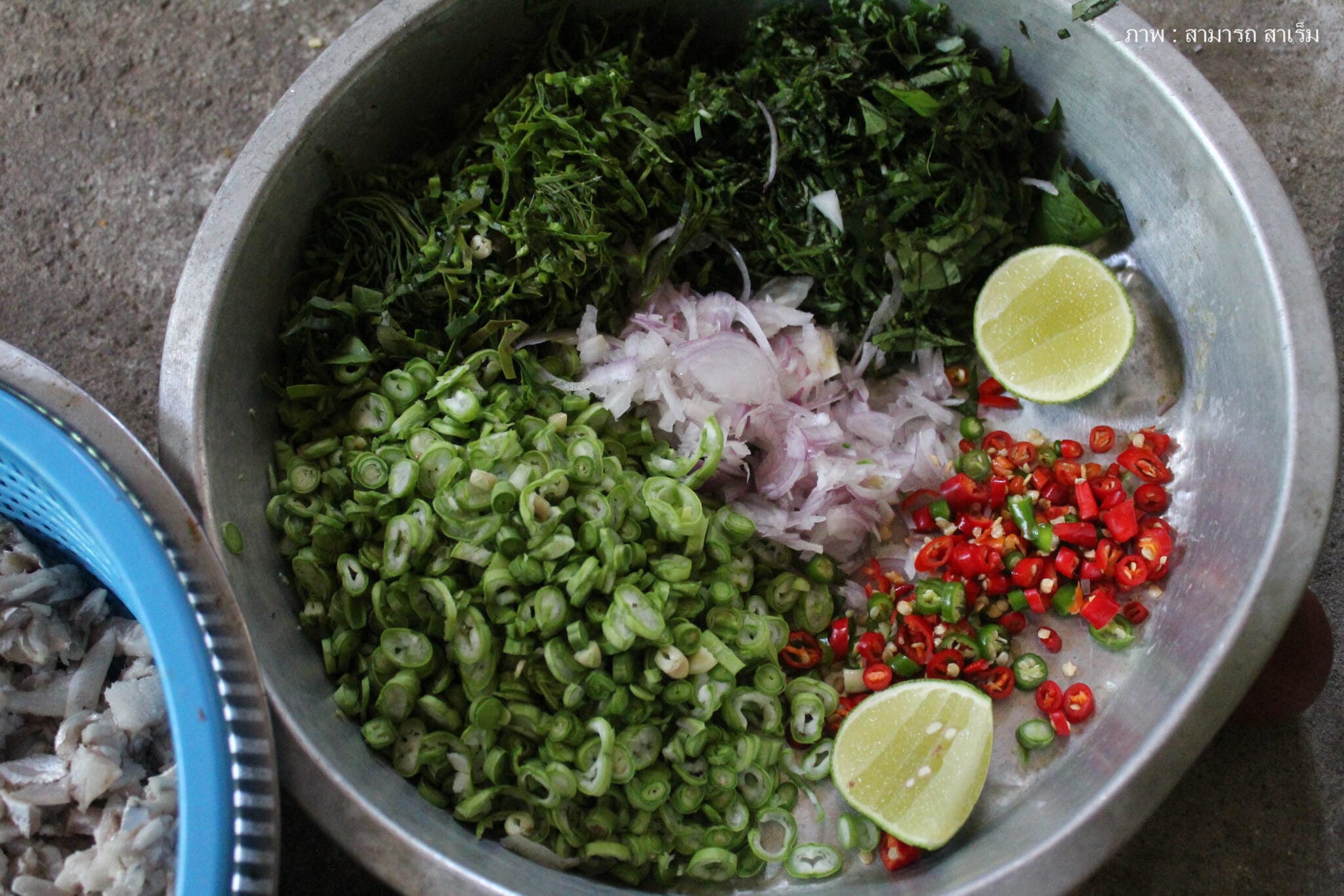 วันนี้วะฉ๊ะเลือกใช้ น้ำมะนาวแทนน้ำส้มโหนด โดยนำมาผักทั้งหมดมาซอยละเอียดรวมกัน เรียกว่า “ผักหมวด” หรือ “หมวด” ขั้นตอนการซอยผักหมวดนี้ ผู้เขียนพบว่าผักแต่ละชนิด มีกลิ่นและรสเป็นเอกลักษณ์ พริกให้รสเผ็ด หอมแดงให้รสหวาน ใบหัวครกให้รสฝาด โหระพราให้กลิ่นหอม ส่วนถั่วนั้นมีรสเย็นเนื้อสัมผัสกรอบ ขั้นตอนการทำเริ่มจากนำผักหมวดทั้งหมดคลุกเคล้ากับเนื้อปลา ปรุงรสด้วยเกลือและน้ำมะนาว ซึ่งเป็นพระเอกของเมนูนี้ ที่ต้องการให้มีรสเปรี้ยวนำ วะฉ๊ะบอกว่า “รสชาตินี้แล้วแต่นะว่าใครชอบแบบไหนรสไหนทำได้เพ…”