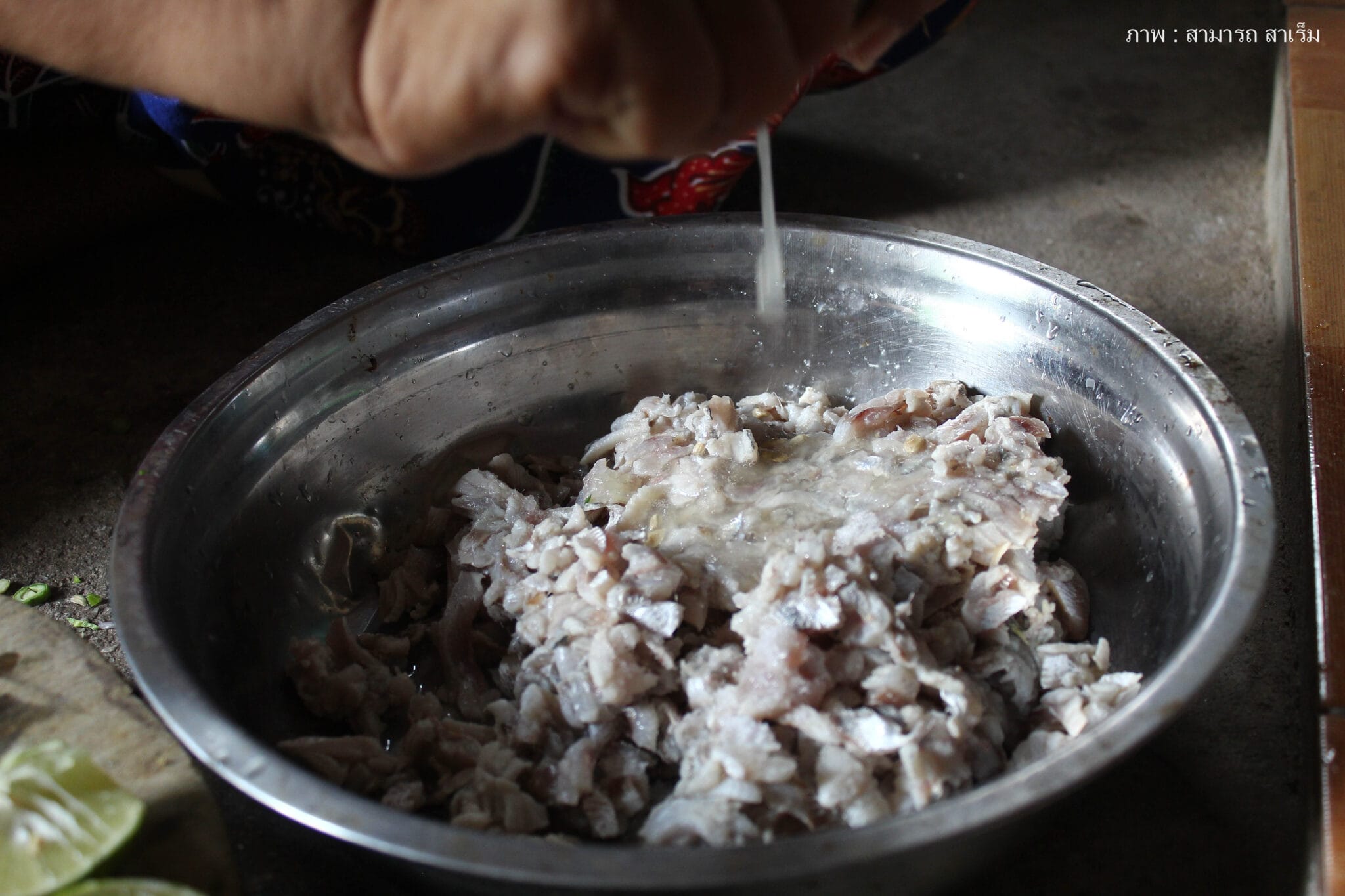 แล้วจึงนำเนื้อปลาที่แล่และลอกหนังเเล้ว มาล้างด้วยน้ำสะอาดอีกครั้ง จนกว่าเกล็ดปลาจะหลุดหมด หลังจากนั้นนำน้ำส้มโหนด ซึ่งเป็นวัตถุดิบพื้นถิ่นจากภูมิปัญญาวิถีโหนดของอำเภอสทิงพระแห่งนี้ มาแช่เนื้อปลาทิ้งไว้ประมาณสามนาที สังเกตได้ว่า เนื้อปลาสด ๆ ที่เเล่ไว้ จะมีสีที่เปลี่ยนไปจากเดิมกลายเป็นสีขาว วะฉ๊ะบอกว่าน้ำส้มโหนดช่วยให้เนื้อปลาสุก แล้วจึงล้างด้วยน้ำเปล่าอีกครั้ง นำมาหั่นเป็นชิ้นเล็ก ๆ ตั้งให้สะเด็ดน้ำ แล้วจึงเข้าสู่ขั้นตอนการยำ