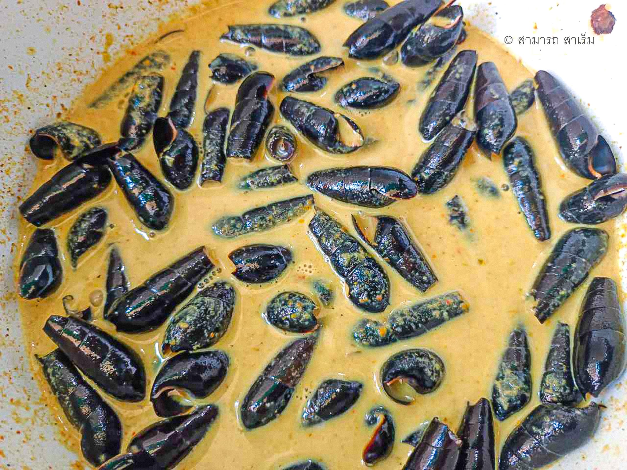 เมนูหรอยที่ทำวันนี้คือแกงคั่ว ที่บ้านผู้เขียนใช้เรียกแกงกะทิ โดยใช้เครื่องแกงที่มีส่วนผสมดังนี้ ตะไคร้ หอมแดง กระเทียม พริกแห้ง ขมิ้น หัวข่า เกลือ กะปิ ตำรวมกันให้ละเอียดเป็นเนื้อเดียวกัน นำกะทิใส่หม้อตั้งไฟพอเริ่มเดือด ตักเครื่องแกงใส่ลงไป คนให้เครื่องแกงสุกส่งกลิ่นหอม แล้วใส่เจ้าหอยหลักไก่ลงไปเต้นระบำในน้ำแกง รอจนเดือดอีกครั้งชิมรสดู เมื่อสังเกตว่าหอยน่าจะสุกแล้วจึงตักขึ้นมาหนึ่งตัว ตั้งไว้ให้เย็น แล้วจุ๊บดู ตัวแรกที่ผู้เขียนตักขึ้นมานี้ จุ๊บออกมาได้ง่าย ๆ เป็นอันว่าหอยสุกแล้ว ซอยใบชะพลู พืชสมุนไพรพื้นบ้านที่มีรสชาติร้อนแรง พร้อมกลิ่นหอมเป็นเอกลักษณ์ เป็นผักที่นิยมใส่ในแกงคั่วหอยหลายชนิด ทำการปิดเตาแก๊ส