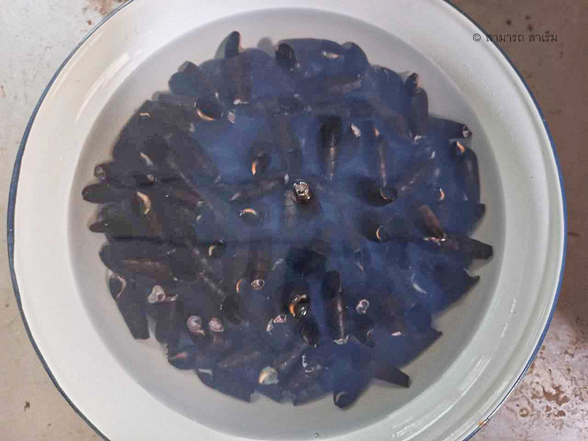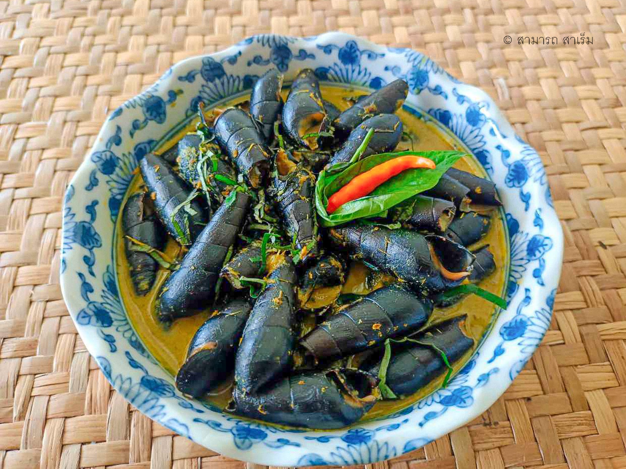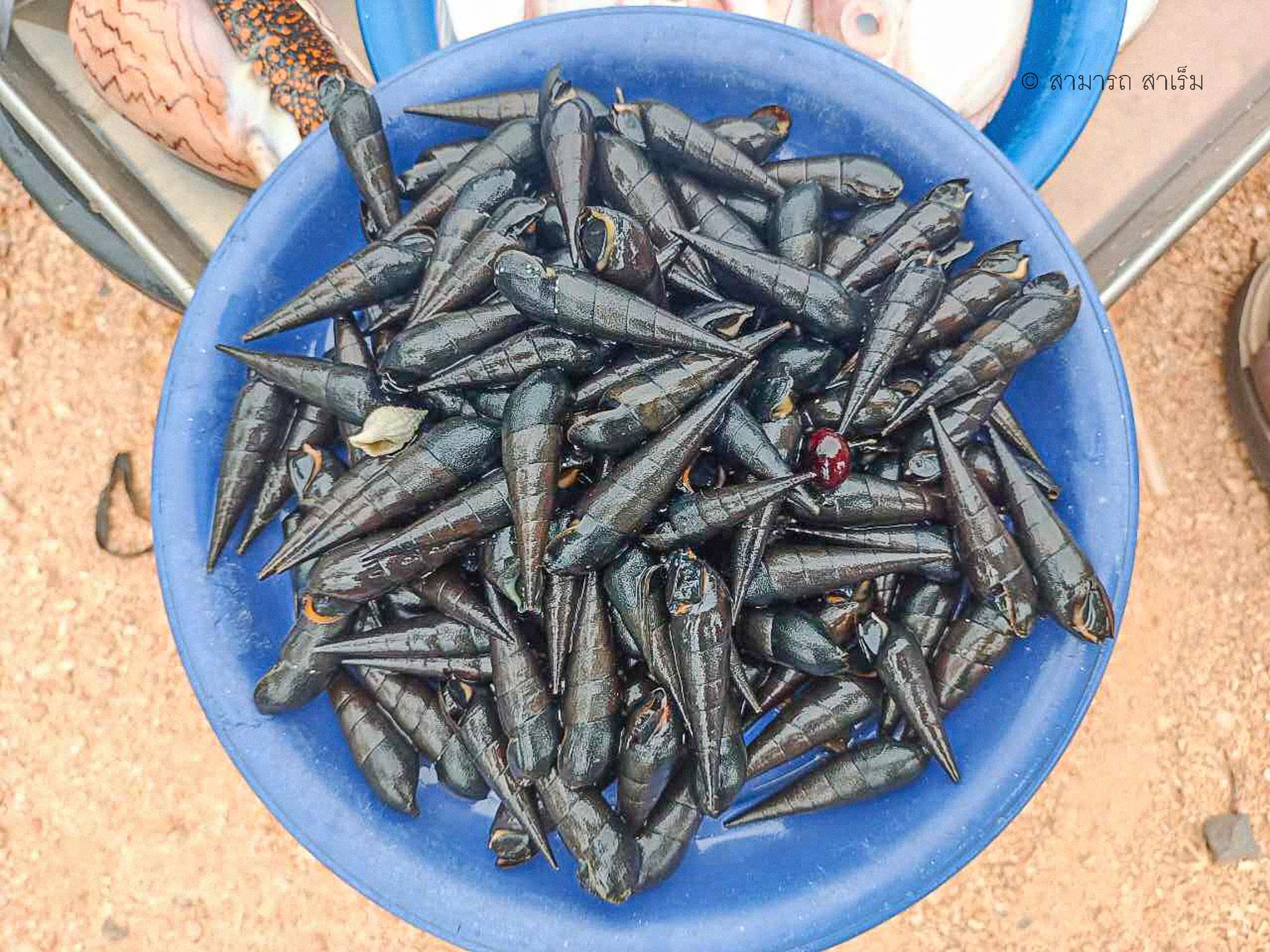 ท่ามกลางความหลากหลายของอาหารทะเล ผู้เขียนได้พบบัง (“บัง”คือภาษามลายูแปลว่า “พี่ชาย” ) ท่านหนึ่ง เป็นพ่อค้าขายอาหารทะเลที่หาได้จากทะเลอ่าวไทย มีปลาหลายชนิดแต่ที่สะดุดตาผู้เขียนคือหอยชนิดหนึ่งสีดำสนิท เป็นหอยฝาเดียว ซึ่งผู้เขียนไม่เห็นมานานมากแล้วที่บ้านของตนเอง จากการพูดคุยบังบอกว่า เป็นคนมุสลิมบ้านเล หมู่ ๑ ตำบลหัวเขา อำเภอสิงหนคร จังหวัดสงขลา เด็ก ๆ ในหมู่บ้านไปหากันที่ทะเลหน้า “หาดปลาไก่” เดินลงไปหาได้ถึงเขื่อนที่กั้นทะเลของท่าเรือน้ำลึก ทำเมนูผัดเผ็ดหรือแกงคั่วก็ได้