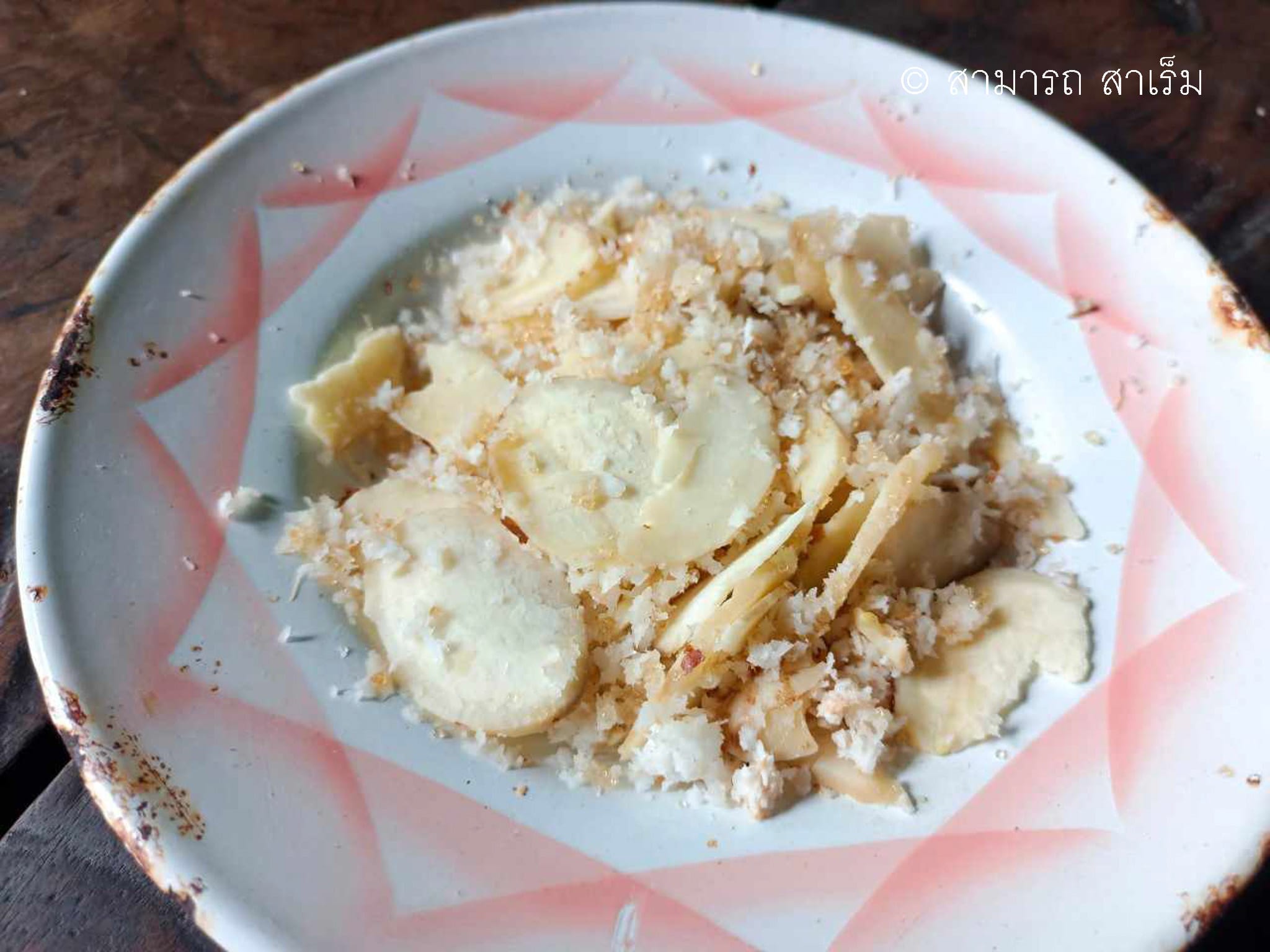 เริ่มจากต้มเม็ดชำดะให้สุก ปอกเปลือกออกให้หมด ซอยเป็นชิ้นบาง ๆ เก็บมะพร้าวจากบนต้นเลือกลูกที่ไม่แก่หรืออ่อนเกินไป ปอกเปลือกแล้วผ่ามะพร้าวให้แตกออกเป็นสองซีก นำไปขูดกับ “แหล็กขูด” (กระต่ายขูดมะพร้าว) ผู้เขียนรับหน้าที่นี้ หลังจากนั้นนำมะพร้าวที่ขูด ผสมเกลือเล็กน้อย ตามด้วยน้ำตาลทราย หวานมากหวานน้อยใส่ได้ตามใจชอบ แล้วนำมา “ยำ” (คลุกเคล้า)กับเม็ดชำดะที่เราซอยตั้งไว้ ให้ผสมร่วมกัน เพียงแค่นี้เราก็ได้ขนมหวานกินเล่น มีรสชาติมันจากเม็ดชำดะต้มผสมรสมันของมะพร้าวทึนทึกที่ขูดกันสดๆและรสหวานนำผสมเค็มนิด ๆ เจืออยู่ ผู้เขียนกินไปหนึ่งจาน อิ่มท้องไปได้หลายชั่วโมงทีเดียว จะว่าไปแล้วกินแทนอาหารมือหลักก็ได้เช่นกัน
