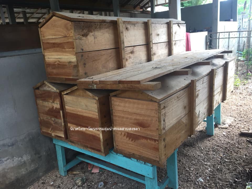 ภาพซ้าย) ลูกหลุมทางด้านซ้ายคนมุสลิมบ้านควน ตำบลคูเต่า อำเภอหาดใหญ่ จังหวัดสงขลา เรียกว่า เลียงหัต หรือ “เลี่ยมหัต” คุณยุทธยา จิตต์โต๊ะหลำ มุสลิมบ้านหัวเขา ตำบลหัวเขา อำเภอสิงหนคร จังหวัดสงขลาให้ข้อมูลว่า “เลียงหัต” คนบ้านหัวเขาเรียกว่า “รุ้ง” ภาพขวา) คือ “กอตะ” ฝาครอบร่างมาหยัดของมุสลิมบ้านบน ตำบลบ่อยาง อำเภอเมือง จังหวัดสงขลา ด้านล่างไม่ได้ปิดแผ่นไม้