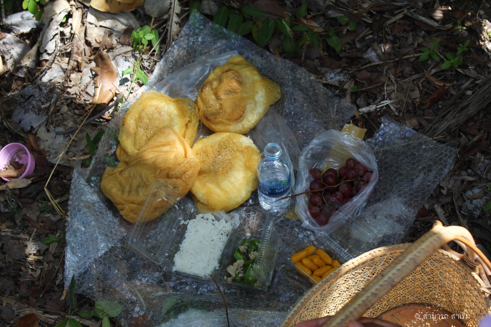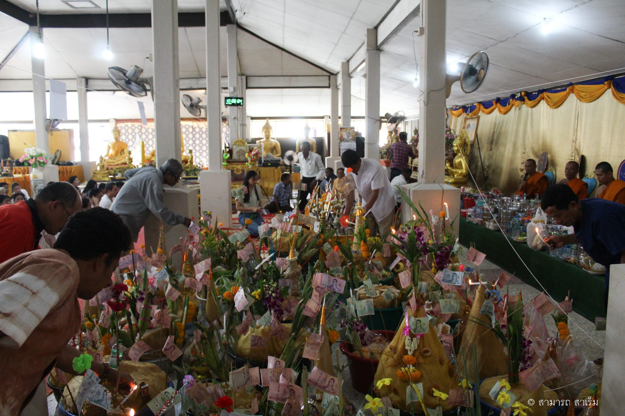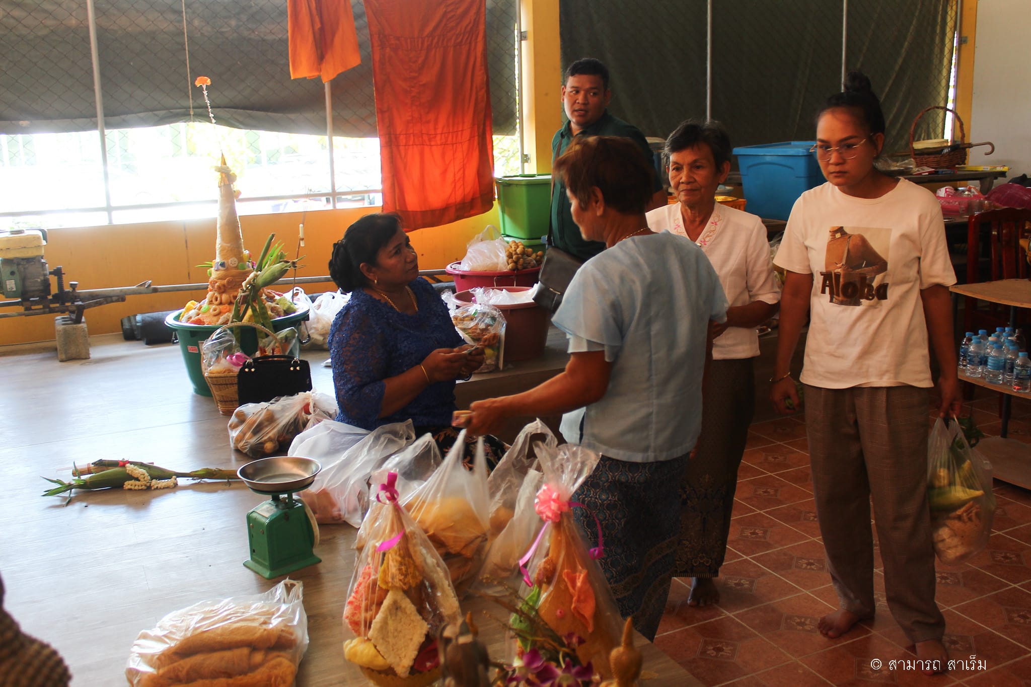 ชาวบ้านกำลังกำลังทอนขนมต่าง ๆ จากเจ้าหน้าที่วัด ผู้เขียนสังเกตว่าขนมลาเป็นที่ต้องการทอนกัน กิโลกรัมละ ๖๐ บาท ราคาถูกกว่าที่ซื้อในท้องตลาด