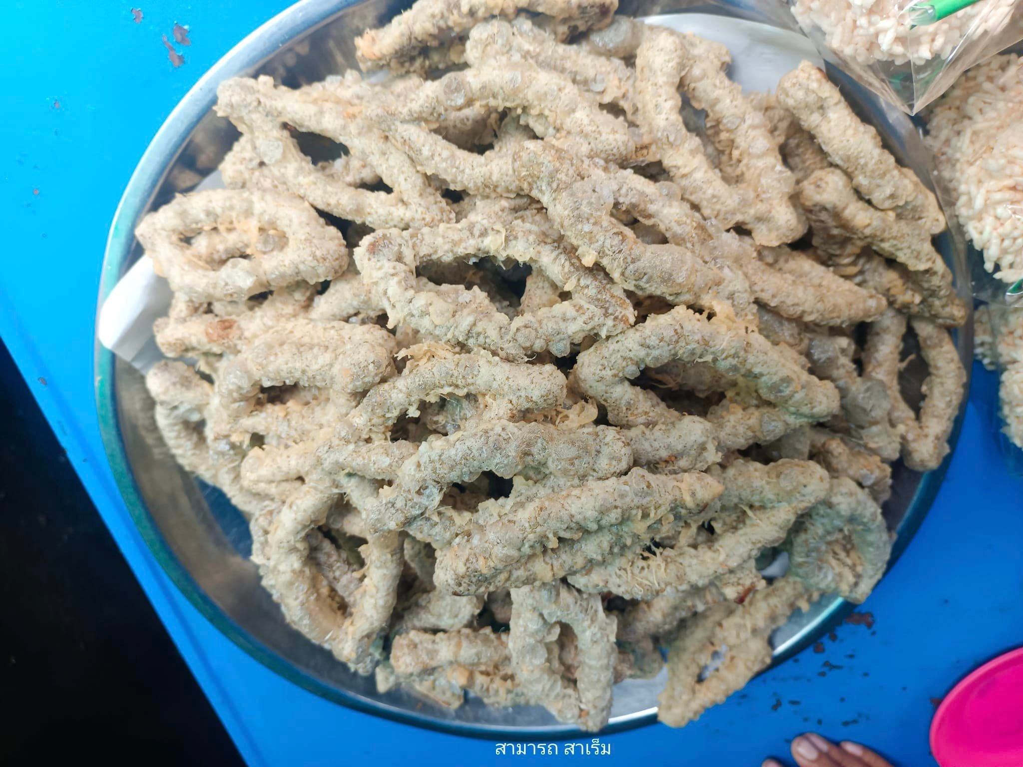 ๕. “ขนมไข่ปลา” ทำจากถั่วเขียวหรือถั่วเหลือง ต้มแล้วนำมาผัดกับน้ำตาลเป็น ปั้นให้มีลักษณะกลมยาว นำสองชิ้นมาติดกัน ชุบแป้งแล้วนำไปทอด ได้ขนมที่มีลักษณะเหมือนกับฝักของไข่ปลา จึงเรียกว่าขนมไข่ปลานั่นเอง