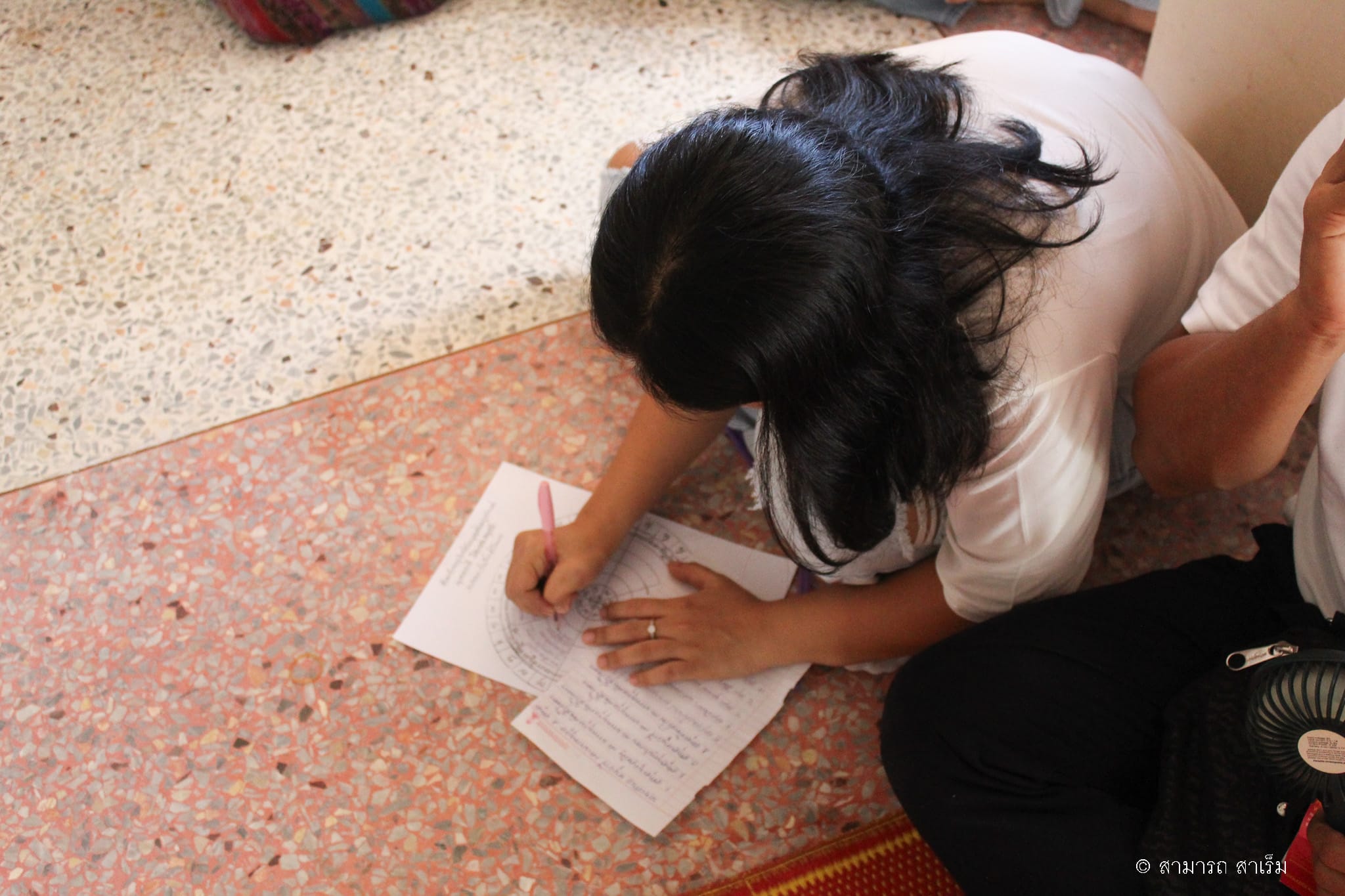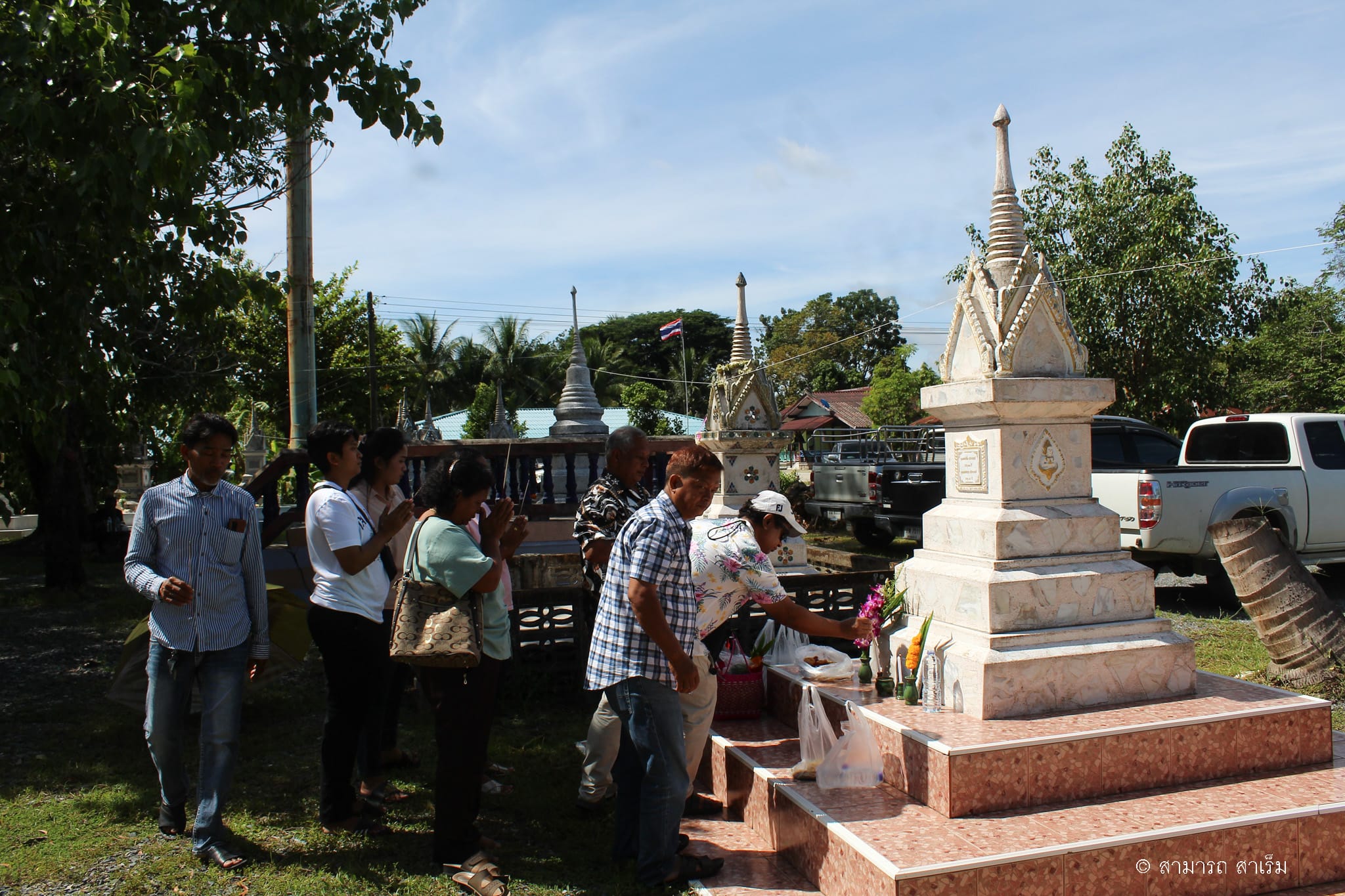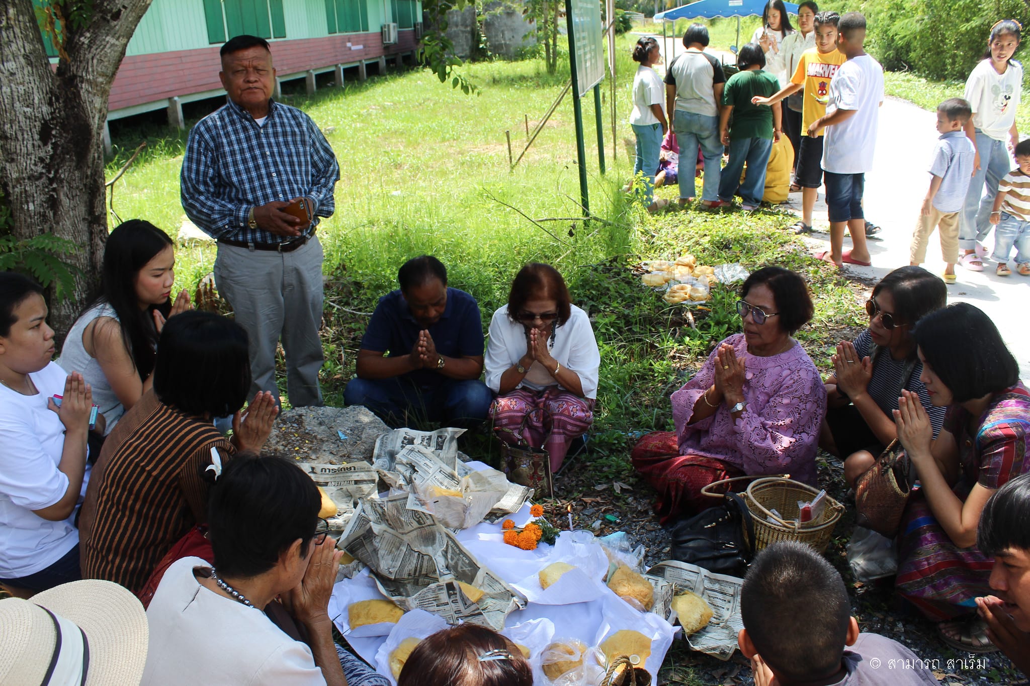 คุณยายบุญเทิ่ม จุลมาศ และลูกหลานกำลังล้อมวงทำพิธี บริเวณนอกวัดเพื่ออุทิศผลบุญให้บรรพบุรุษที่ล่วงลับที่ไม่สามารถเข้ามาในบริเวณวัดได้