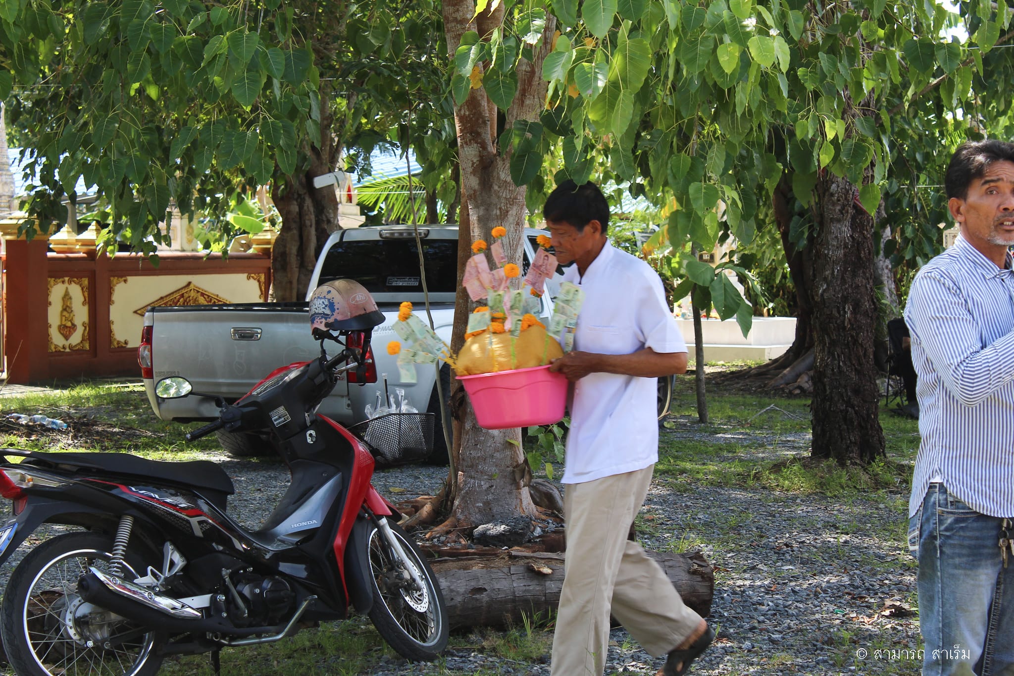 คุณลุงคนบ้านโคกข่อย กำลังนำหฺมฺรับที่ดับอย่างพิเศษที่สุดไปยังโรงธรรมของวัดโคกข่อย เพื่ออุทิศผลบุญให้บรรพบุรุษที่ล่วงลับ