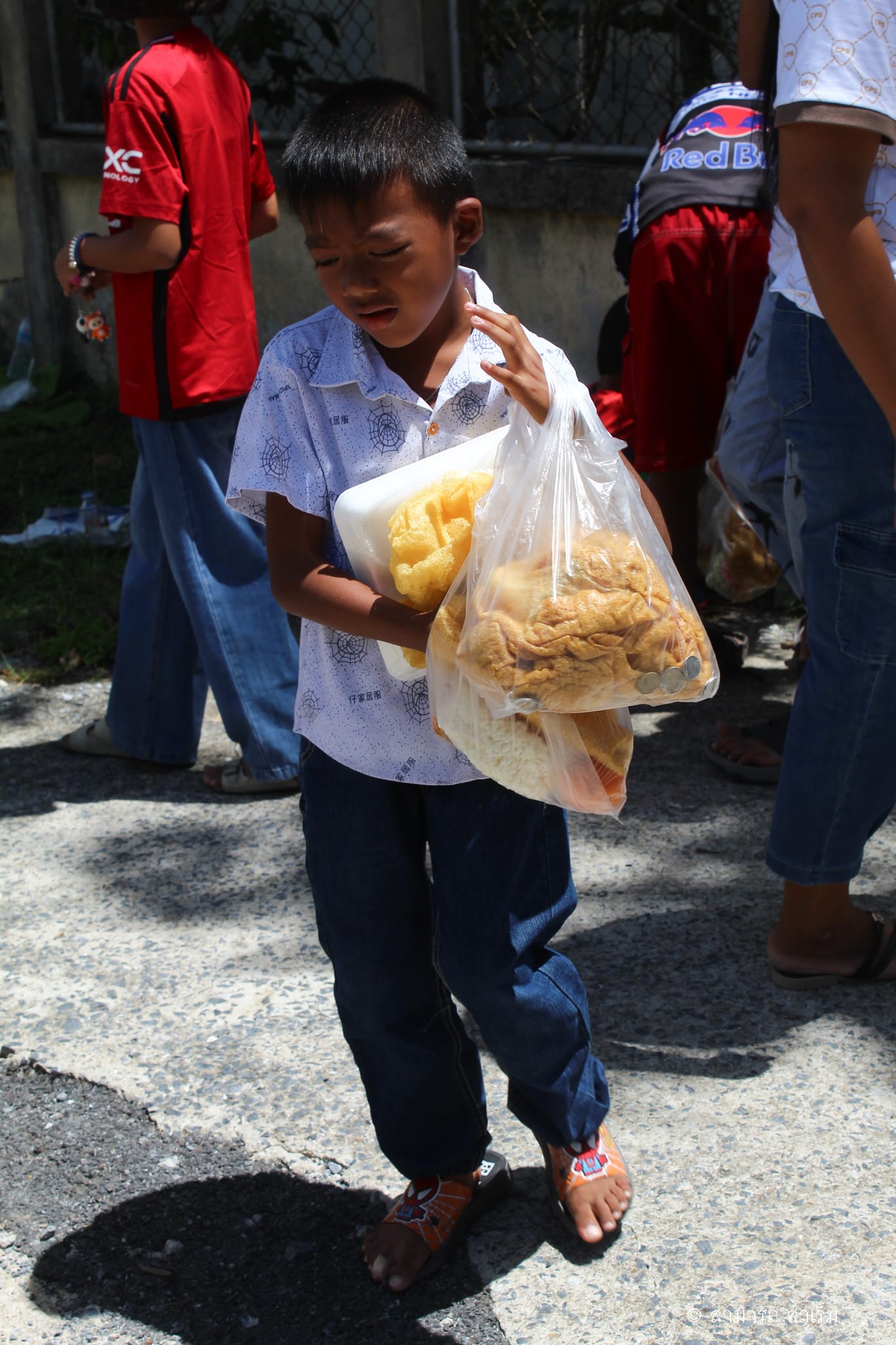 หนุ่มน้อย กับขนมและเงิน ได้จากที่ชาวบ้านนำมาตั้งนอกวัด